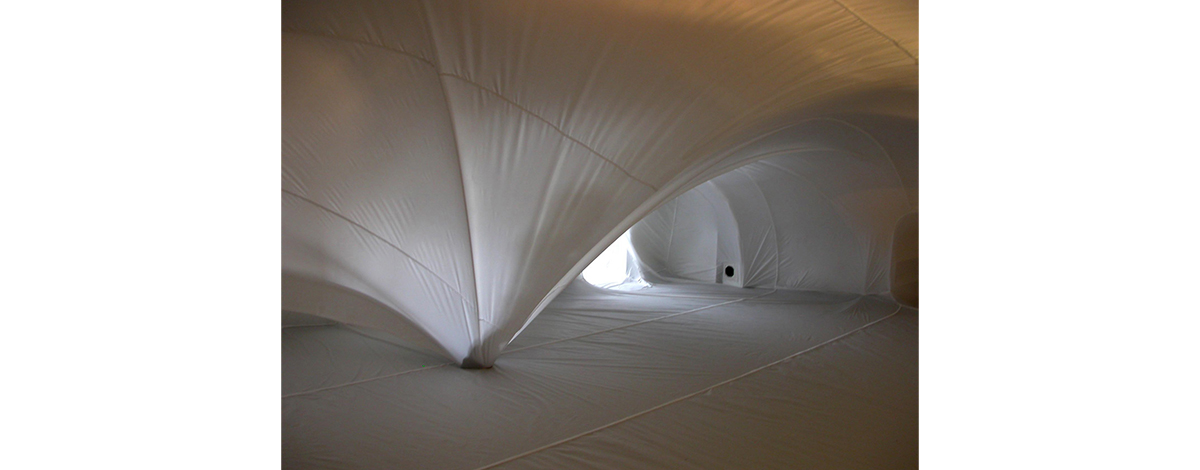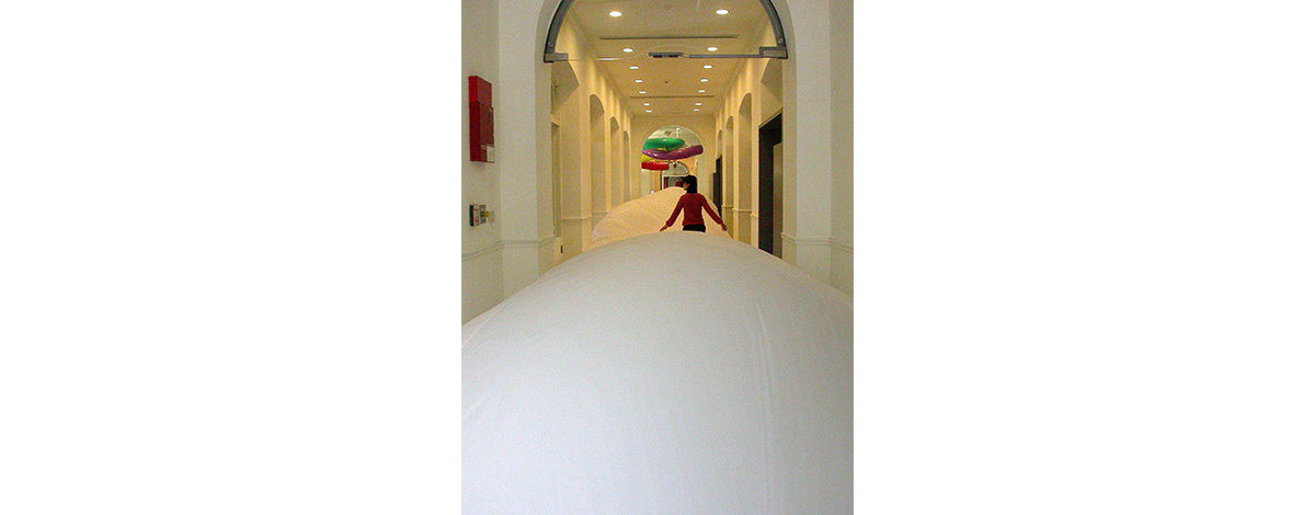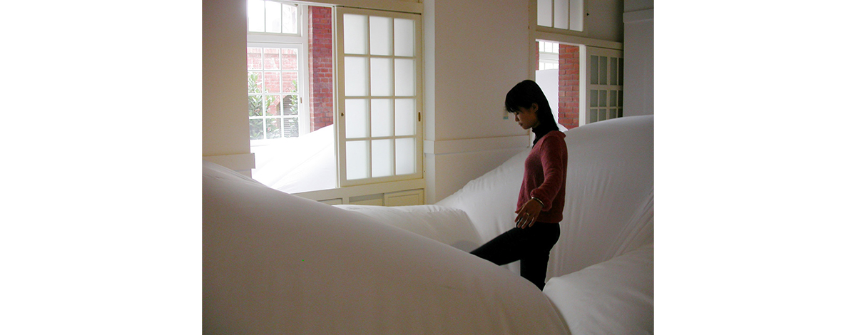 談到王德瑜的創作,最引人矚目的就是她的氣囊裝置。它通常是由布幕包裹,充氣而成,蘊含著一種造型的張力,並引導觀眾不斷移位,在它的內外空間進行種種觸探與遊玩。這是它律性與他人參與的空間營造,體現了當代藝術理念一項重要的轉折。在此當中,「膜」始終扮演著關鍵性的角色;它不僅是造型上的課題,更重要的是把我們帶往當代主體經驗的想像上。