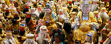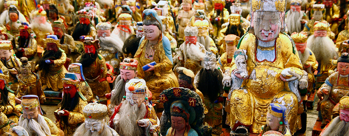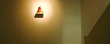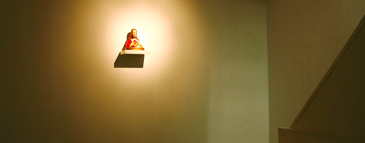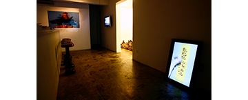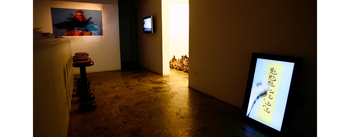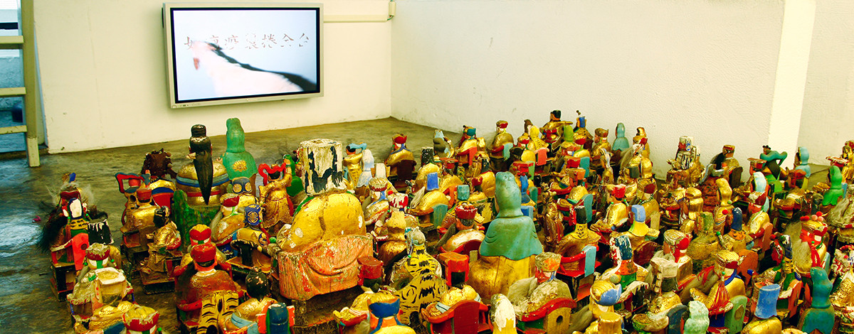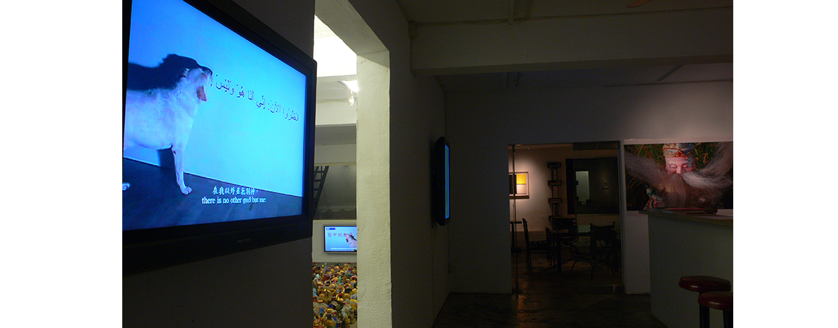 "Beware of GOD"的展覽名稱,諧仿自某些人家門口懸掛的"Beware of GOG"。英文的狗(DOG),倒過來恰巧是神(GOD),狗之於人,人之於神,權力關係正好也是反向。許多人養狗寵狗,自身也希望得到神明的特別眷顧。家中飼養貓狗,客廳供俸神明,是民間常見的寫照。但這一切,終究是以人的好惡為中心,家狗因不再受人寵愛而流浪街頭;神像因失去信仰而逐波江河,同樣也是台灣特有的現象之一。