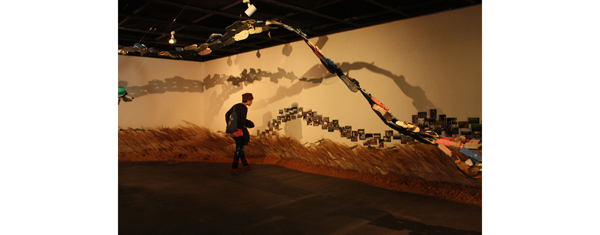 「Fali-yos颱風計畫-消失後的入侵」是拉黑子以拖鞋為主要媒材的「颱風計畫」系列作品,他以颱風必經路徑與南島民族遷移路線,提出和海洋、島嶼有 著密切關連的論述,延續其長年關注的族群文化議題,並將環境、生態的問題含括進來。利用流動的線條與光影搭配,藝術家試圖與颱風正面對話,進而省思人與自然間的關係。