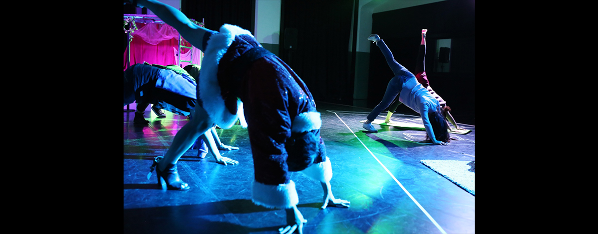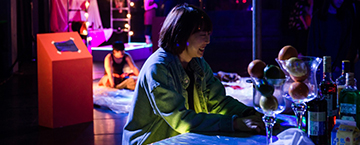 「導覽耳機是第二個空間很重要的觀看媒介,這種聲音的距離感讓觀眾與解說員形成特別的關係。」洪唯堯說,距離感不同,也就產生「擬真、感染、渲染」的效果。全戲最後,觀眾跟著「櫥窗女郎」做瑜珈,他們可以自行選擇收聽三種不同的耳機頻道音樂,搭配眼前莫名其妙出現的瑜珈。