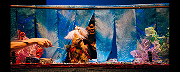 而承擔此次布袋戲跨刀操偶的,則是「弘宛然」吳榮昌和「山宛然」黃武山兩位知名演師。「這是我們首次捨棄彩樓,以立體空間為舞台,一開始很沒安全感。」吳榮昌笑道,布袋戲是非常即興的藝術,現代劇場卻有它的運作規則,演師還得從幕後走出來,苦練走位和背台詞,必須花時間彼此適應。此次演出形同布袋戲藝術的「懶人包」,除了展現說唱技巧,更能見到細緻而精巧的操偶手法,諸如梳髮、脫衣、游泳等動作,再搭配與現代劇場結合演出,增強戲偶與戲中角色的生活連結,暗喻了時代背景及故事主人翁的內心世界。