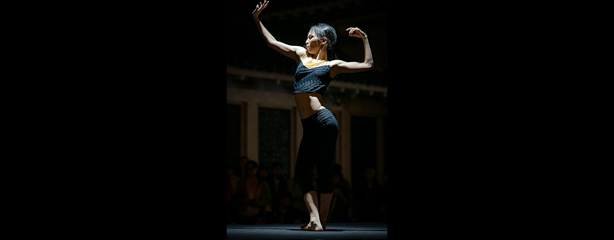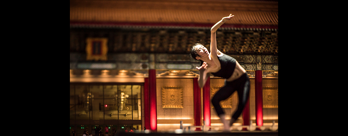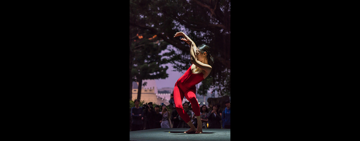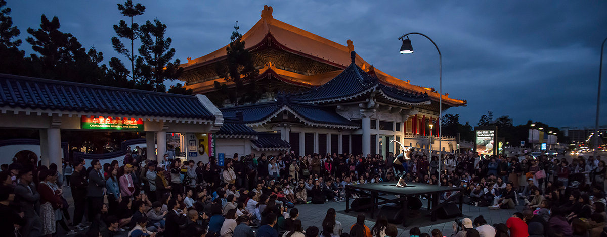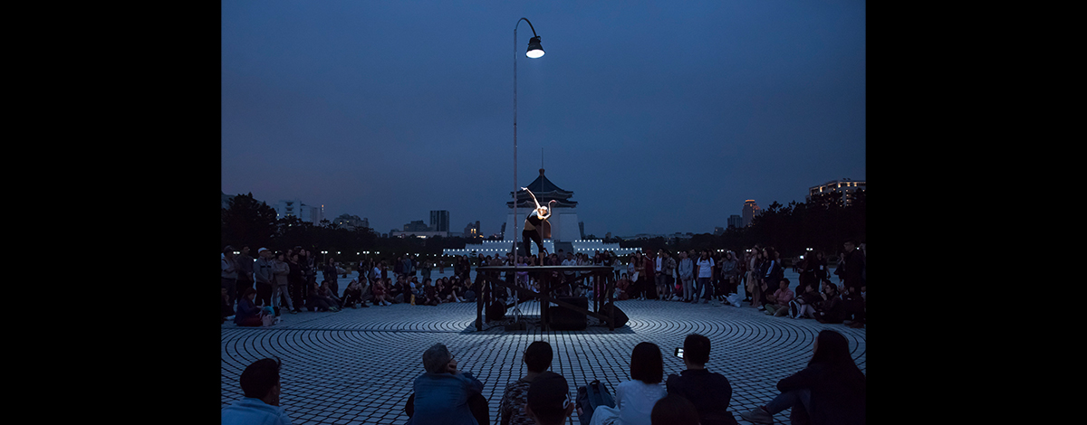 量身打造之外,另一任務,是要推進「自由步」最初分享舞蹈的想望。蘇威嘉尋找跟觀眾相遇的理想方式,將劇場規模的精緻搬到戶外。《一盞燈的景身》台北場輪番在兩廳院周圍五處進行,三平方公尺舞台上,僅高立燈光打落,如切割出凝滯時空;聲音設計澎葉生(Yannick Dauby)則從常景擷取旋律節奏,與城市聲景渾然天成。舞作於日落時刻開演,隨天色漸暗,周遭城市光影、街車熙攘,漸對映出燈下舞者動作線條、肌肉氣息起伏。