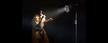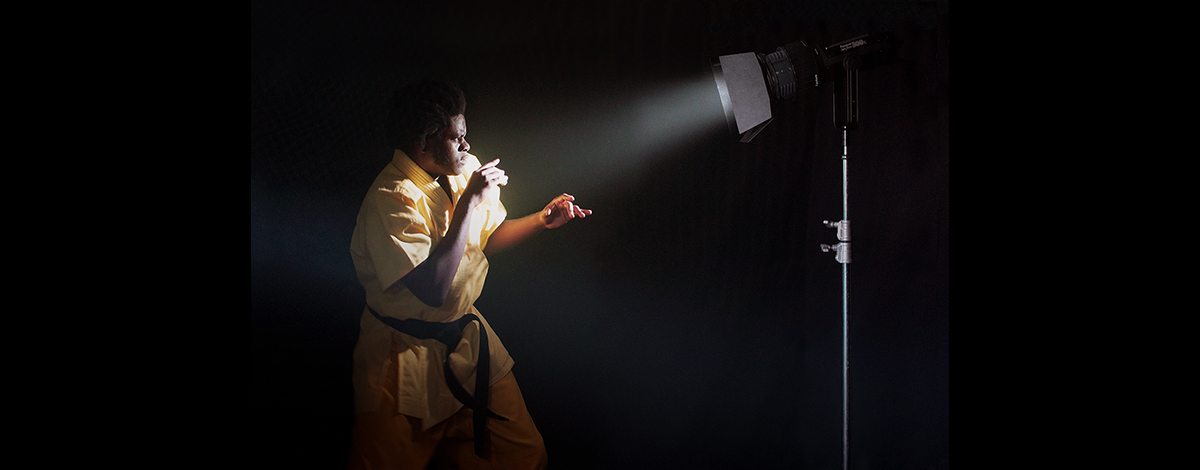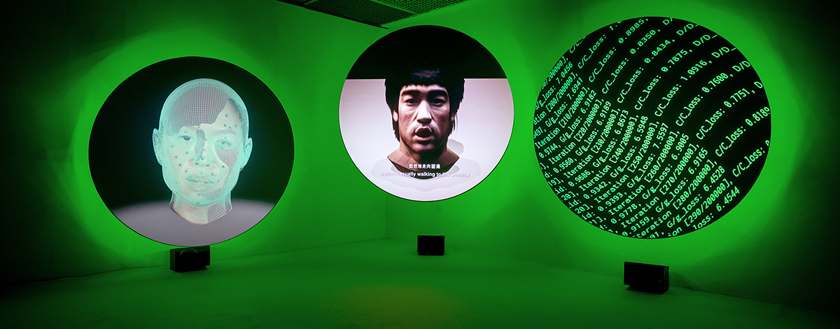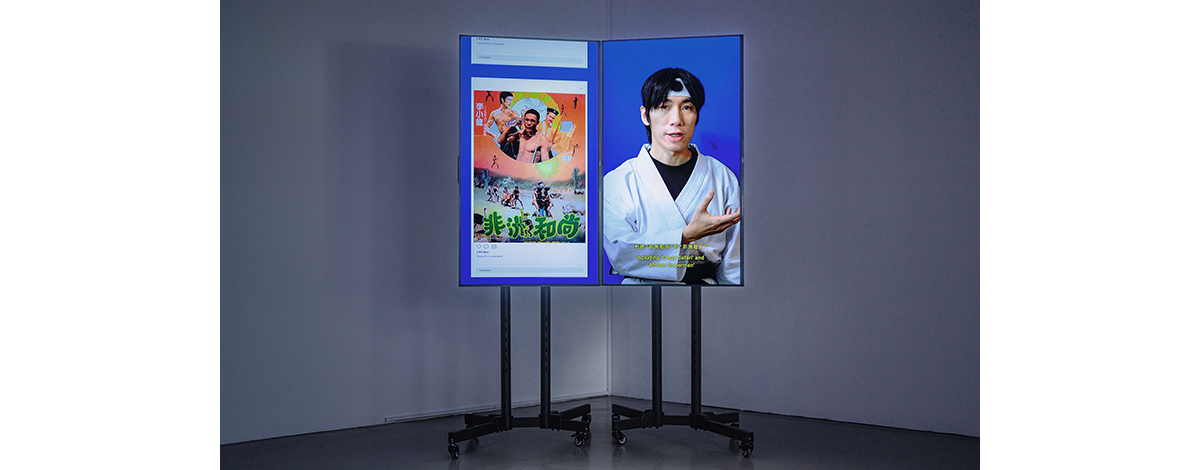 最後一件作品《打光》以三頻道錄像的形式,不時穿插以臉部動態捕捉與語音辨識演算法訓練出的李小龍形象作為文本的敘事者,並編織三條主要敘事:與西非多哥(Togo)的攝影師一起討論如何透過打光彌補攝影器材對深膚色的曝光不足;訪談聯發科技開發臉部辨識演算法的工程師,呈現他們如何打造因應非洲當地的相機演算法;以及使用1970年代的柯達類比底片拍攝帶有剝削電影(Exploitation Film)風格的功夫電影片段,以該年代知名黑人功夫明星吉姆.凱利(Jim Kelly)形象,將「打光」幽默地結合功夫,把「打」化為動詞,「光」視為對手。