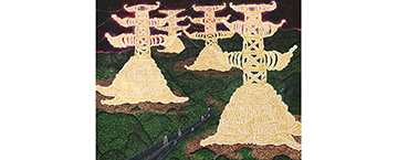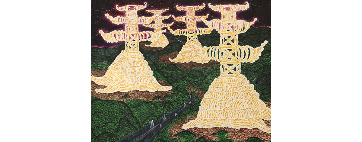而在蕭其珩的談話當中,也會聽到他使用一些特殊的比喻,例如「套餐」、「漫畫分鏡」來描述自己的畫作或展覽的敘事。他解釋「套餐⋯⋯有點像是一個set,在一面展牆上可以組成同一個脈絡。裡面會有大張的主餐、旁邊配成套餐的小幅作品可能來自其他不同觀看視角或者有關聯性的物件。」在此次個展中,一幅130×162公分的《高壓電塔之家》,其左側的小幅作品《洗車的景》則描繪著由車內向外望去的視角,兩者的並列呈現了如分鏡一般的閱讀效果。