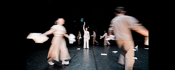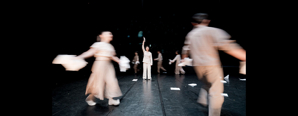 啟發自戲曲美學、幾近無物的空台上,表演構成了舞台的一切。以走圓場開啟,或臺中國家歌劇院版演員注視小劇場連結戶外隔音門緩緩落下,都塑造獨特的時間感與空間感。演出中段,眾人拎抱著樂器,在靜默的黑暗中斜向穿越舞台,暗喻了大時代下戲子命運,以及映照了個體、生命關係的流轉與渺小。