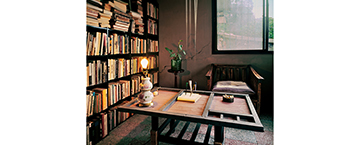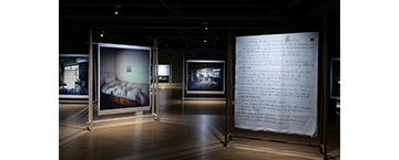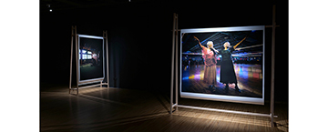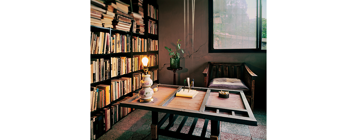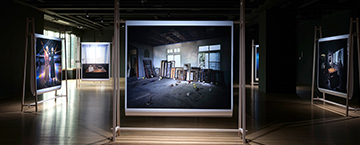 一座座比人高上一些的木製立架,垂掛著24張印有葉偉立20多年來拍攝的大尺幅影像,內容揀選了他剛回臺灣時,在寶藏巖創作的編導式攝影、《 古董級垃圾研發公司在北投》 、整理葉世強故居和自己工作室時的影像創作,以及在這個計畫籌備期間所拍攝的、呼應作家郝譽翔小說《溫泉洗去我們的憂傷:追憶逝水空間》(簡稱《溫泉洗去我們的憂傷》)的影像。像是畫報看板林立形成錯置不同時空的迷宮,穿梭其中還能從美術館大片窗外遠眺北投風景。