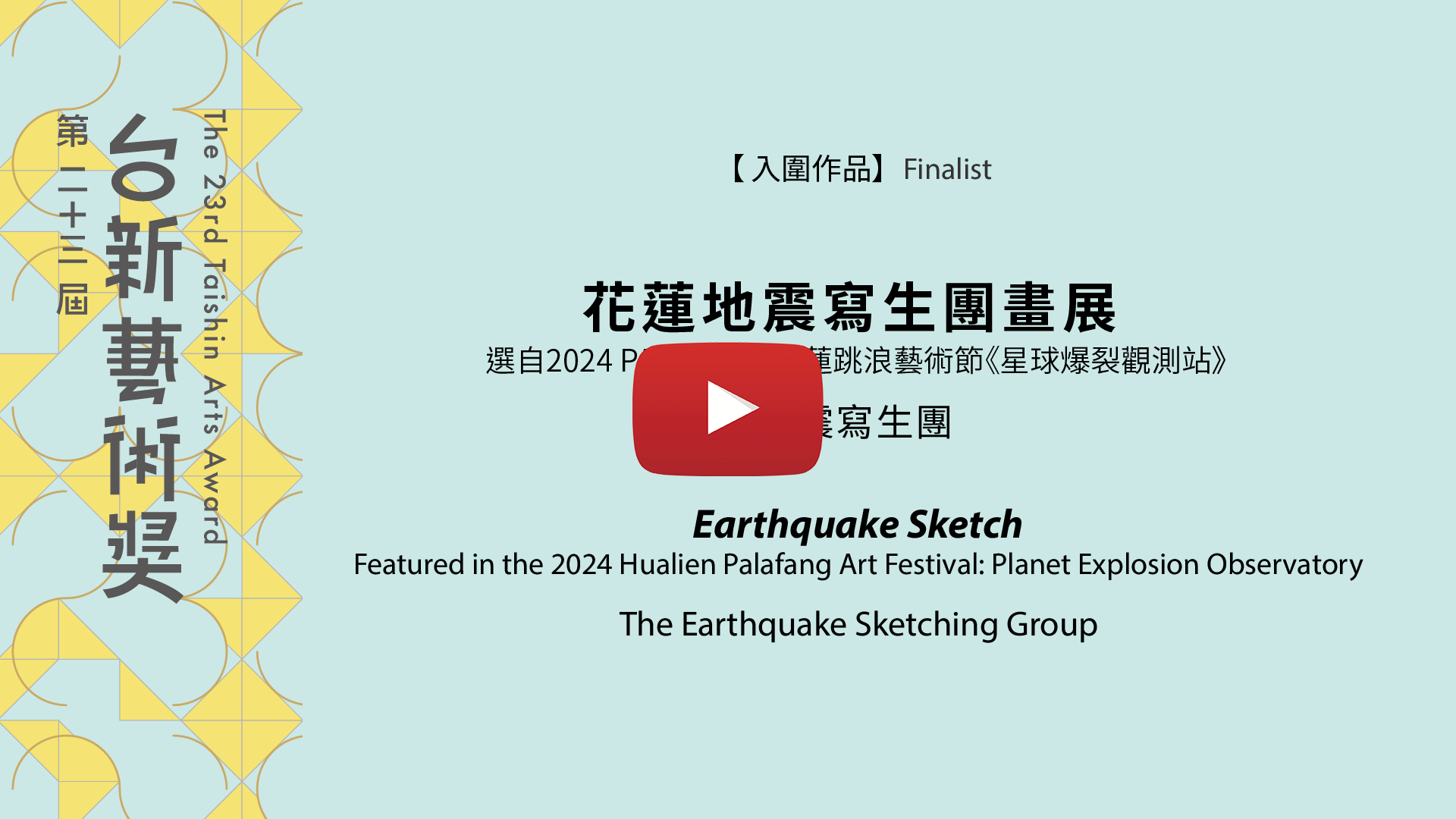 「地震寫生團」是由15位花蓮在地年輕藝術家組成,他們彼此是0403花蓮地震發生時的當事者,並在事件發生後成為觀察者,在雙重的角色堆疊下,決定以外出寫生的方式,實地探索地震後的地貌景觀變化,藉由繪畫、攝影、動態影像與現成物所組成的空間裝置等媒材,以創作的形式記錄下當下的時間與空間。