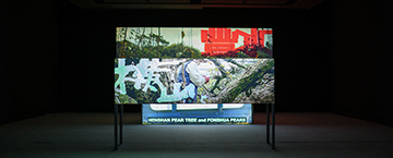 當投影畫面上的倒數數字結束,高低不同的三頻道影像空間裝置,便開始播映三種不同的鏡頭與敘事,當觀眾站在展場正中央時,每一道投影的敘事與時間便會彼此嫁接,在單點透視的視線中呈現出三段時間──接地的橫山母樹、農人在果園中的勞作、以及結滿果實的接枝與天空。陳亮璇以此形式展現動態影像作品《橫山豐水》,內容呈現她細膩紀錄臺灣卓蘭梨農與果園三年來的農忙細節,以及在這之中感受到各自面向所經歷的時間性。