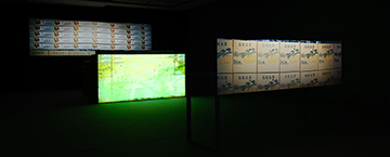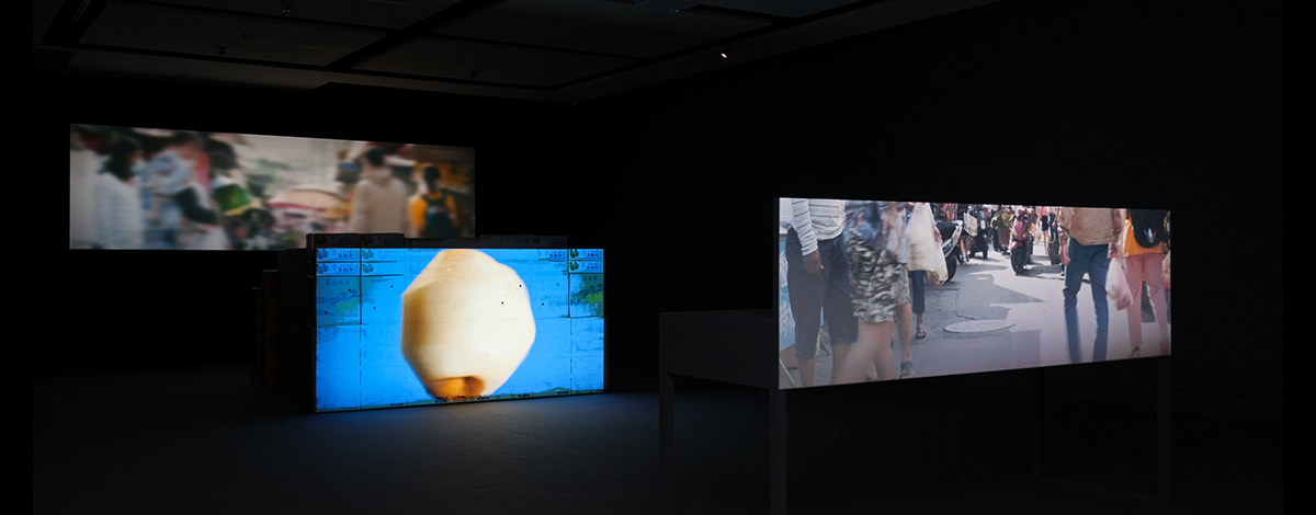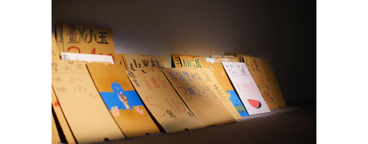 在關渡美術館一樓個展《橫山豐水》 的展場外圍牆邊,陳亮璇排列了一整排蔬果紙箱,引導觀眾感受果農收成後的現實感。然而,一走入展場,原本蔬果紙箱帶來的現實感,隨即被三組平、中、遠不同距離的投影裝置所投射的倒數時間抽離。