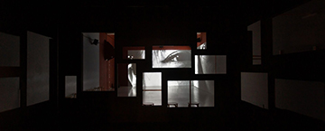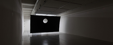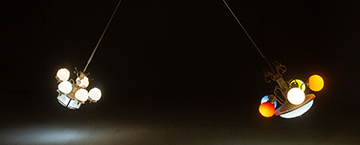 如同走入一場銜接生死的儀式,觀眾來到展場首先看到的是由狹長的展間底部迎面而來一堵〈會飛的牆〉。這組以機械裝置構成的牆,隨LED白光明滅而移動,牆面吞噬光源,黑影推移釋放,直至牆體全面籠罩原先潔淨白亮的白盒子空間。觀眾側身走入美術館如十字架結構般的空間頂部,右側〈開光的吊燈〉像是從數年前基隆「正義路安魂曲」展場緩緩擺盪至此。「正義路安魂曲」中透過逝者托夢而實現的作品環節,為彭弘智打開感知四維度空間之眼。他將作品視為一個場域,藉靈媒邀請逝者的能量進入場域,讓整體創作(逝者的作品與他的作品)持續在一個成長的狀態。展間的前方則是「參與」展覽的三位前輩藝術家紀錄影像。再轉身向左翼空間,牆面垂直接縫處以雙屏幕投影著〈未完成之作〉,這件作品暨似紀錄片又像靈媒編劇,也是虛構劇情片及表演藝術影像。