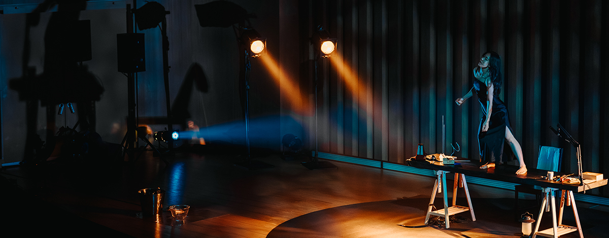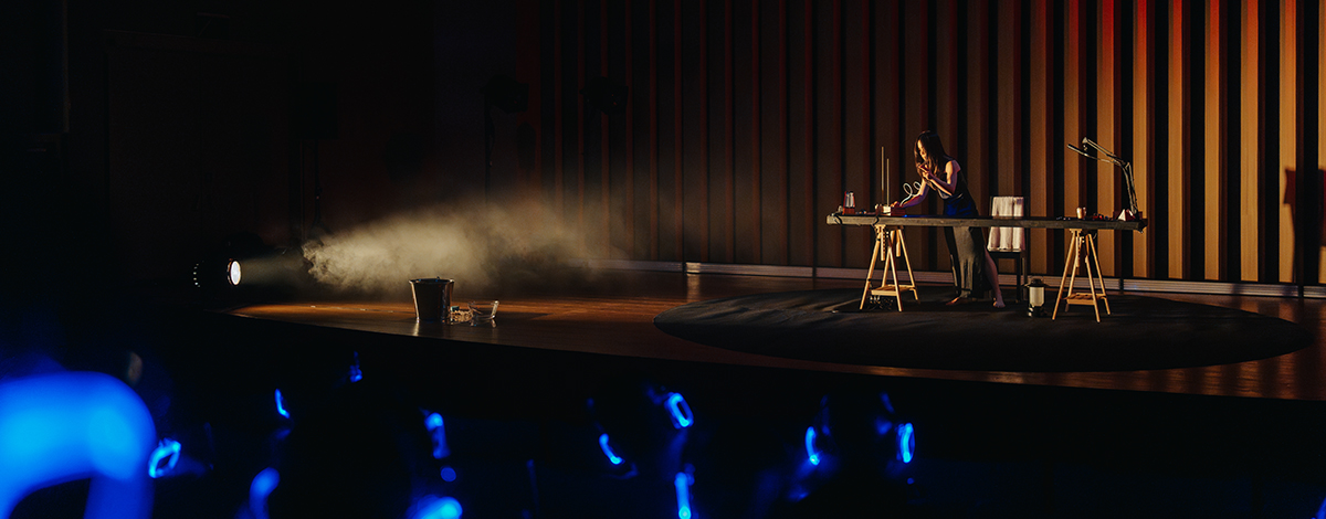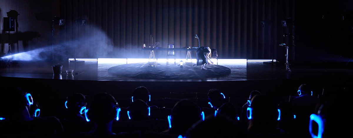 《乘上未知漂流去》運用獨角戲與精準的聲景交織,順著家族女性跨海遷徙記憶的這條引線,建造出以聽覺為核心的劇場結構。表演強調聲響、空間方位與耳機聆聽的機制,使聲音成為時間流動與情感轉換的符號系統,既是情境,也是歷史的殘響,並將個人記憶中最細微的部分轉化成可被直接感知的訊號。這種「轉換接收器」,以聲音進行書寫的劇場語彙,突破傳統觀看戲劇時對於可視再現的依賴,給予不同的觀演視角,也重新定義了「在場」的感官意義。(主筆/張尹芳)