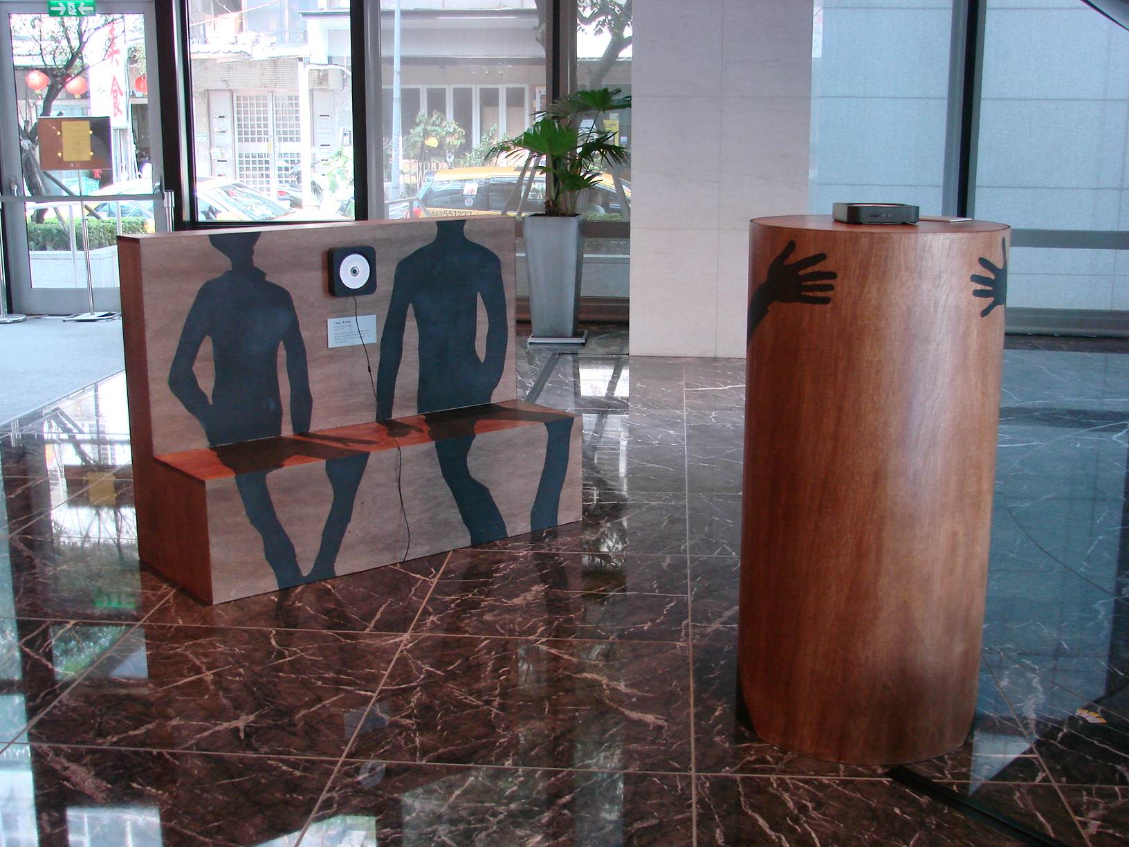 家具上放置著改造的CD播放器,觀眾將雙手掌接近播放器旁的油墨記號處,歡樂耶誕歌曲隨即播放出,雙手放開,音樂即停止。作品表達在面對音樂、聲音時專注聆聽的狀態。