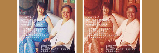 大量東南亞外籍配偶的移入,形成了台灣新一代的多種族色彩,然而外籍配偶的母國文化卻在父權體制與台灣文化優越論的基調下,隱晦而蒼白;2009年的〈望向彼方─亞洲新娘之歌(III)〉緣於亞洲文化協會的獎助,得以在2008年的夏天探視了過去三年所曾訪問的外配姊妹們的原生家庭,造訪了越南的胡志明市及南部的茶榮省、薄寮省、永隆省,西部的西寧省的七位外配姊妹的父母與家人,這次的越南行成為構築2009年“望向彼方─亞洲新娘之歌III”的作品的主軸。
