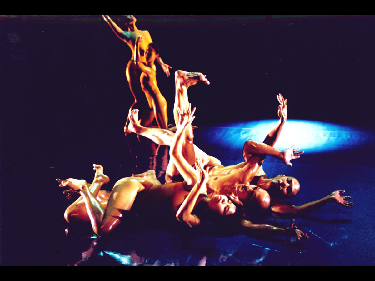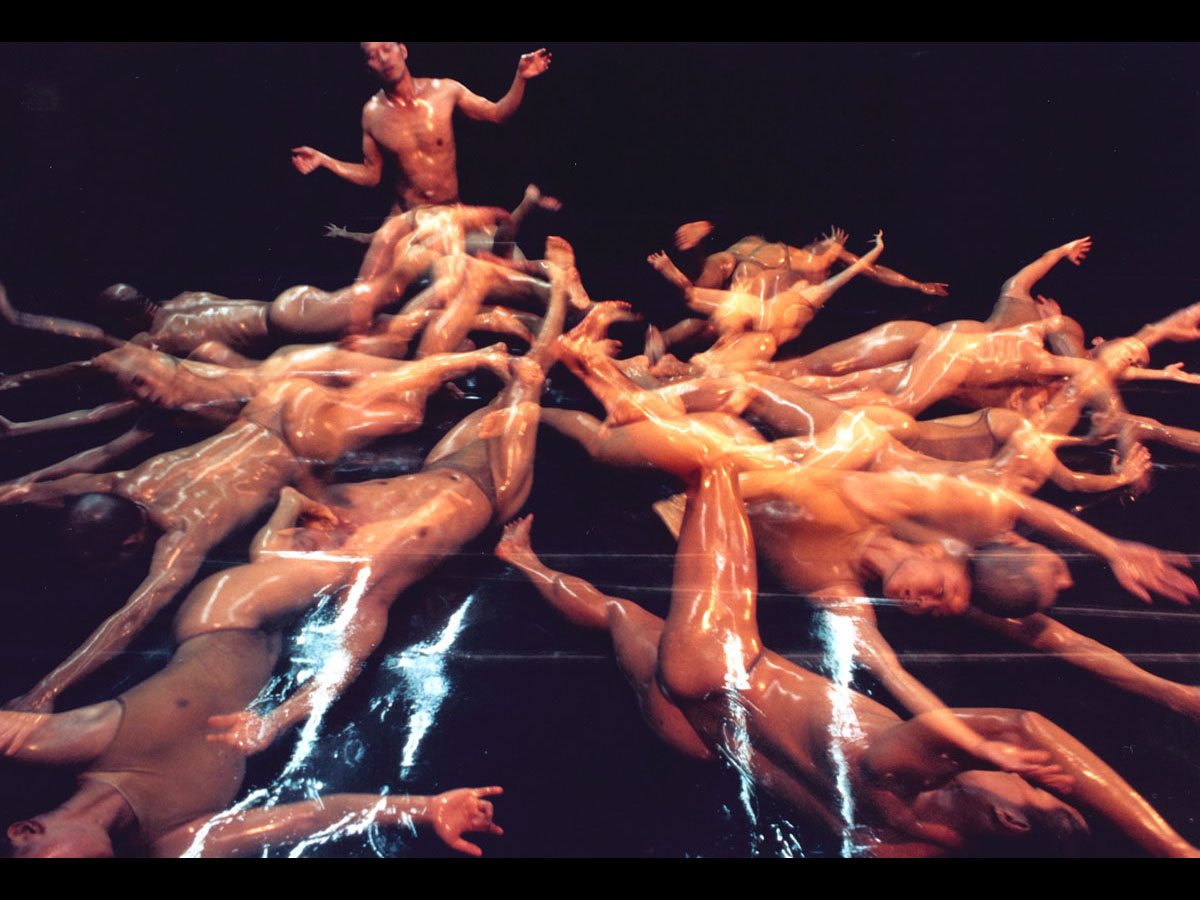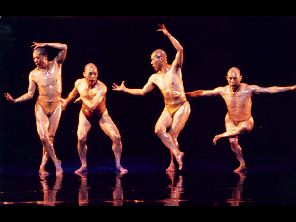 By his dances in their incomparable style, he has constructed an innovative body of work, notably by coating baby oil on both the stage and the almost naked bodies of his dancers, so that nothing hinders the movement of the dancing, where elements of Qigong, Tai Ch’i, Zen are combined, he brings also his philosophy of “Ch’i, Body and Mind” into dance. Since 1992, the works of baby oil series been presented are Olympics、Oil Painting、Ode to a Paramecium、Black Tide、Faults and in 2002, he created Flow.