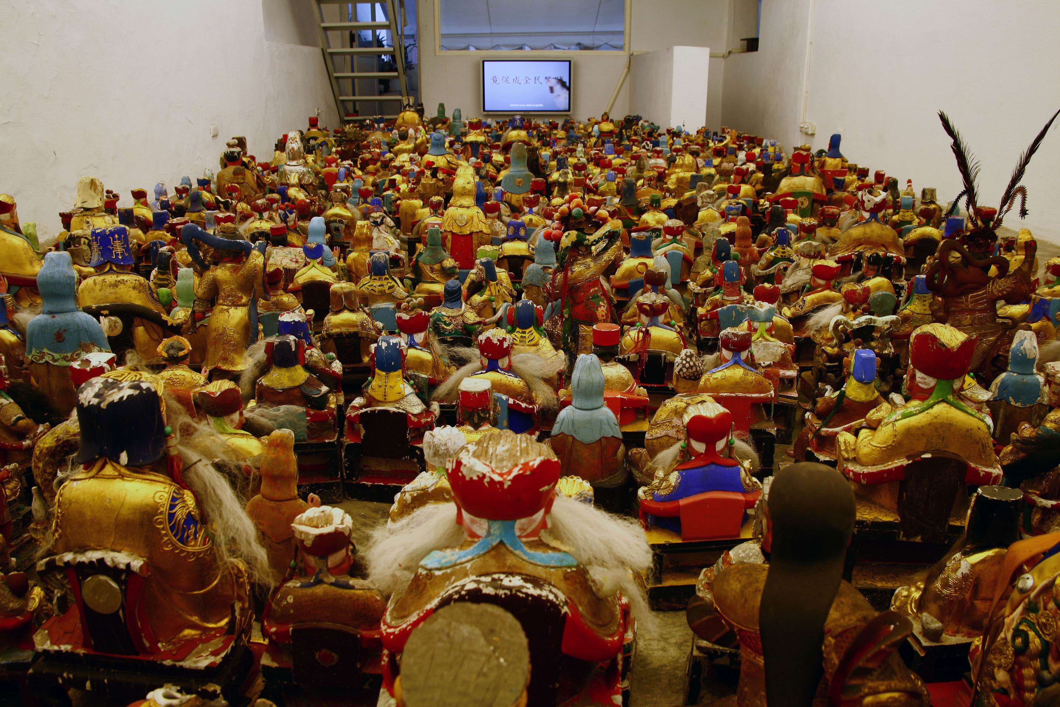 Hungchih Peng creates a multi-media exhibition that combines video and found objects to question idolatry in secular religions, and the relationship between technology and humanity. Beware of GOD embodies the neo-figurative language of contemporary art today, Peng uses humor through the manipulation between the symbol of God and a domestic dog. The installation critiques the common desire for material wealth through the juxtaposition of the ancient and the new, the digital and craft, and the text and the image. Beware of GOD contributes to a global dialogue about existence in the age of merging cultural identities.