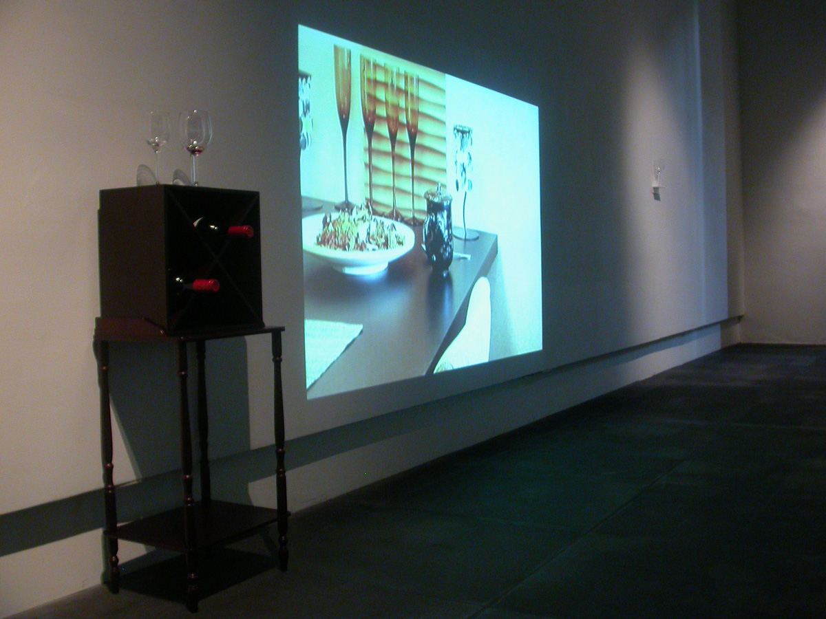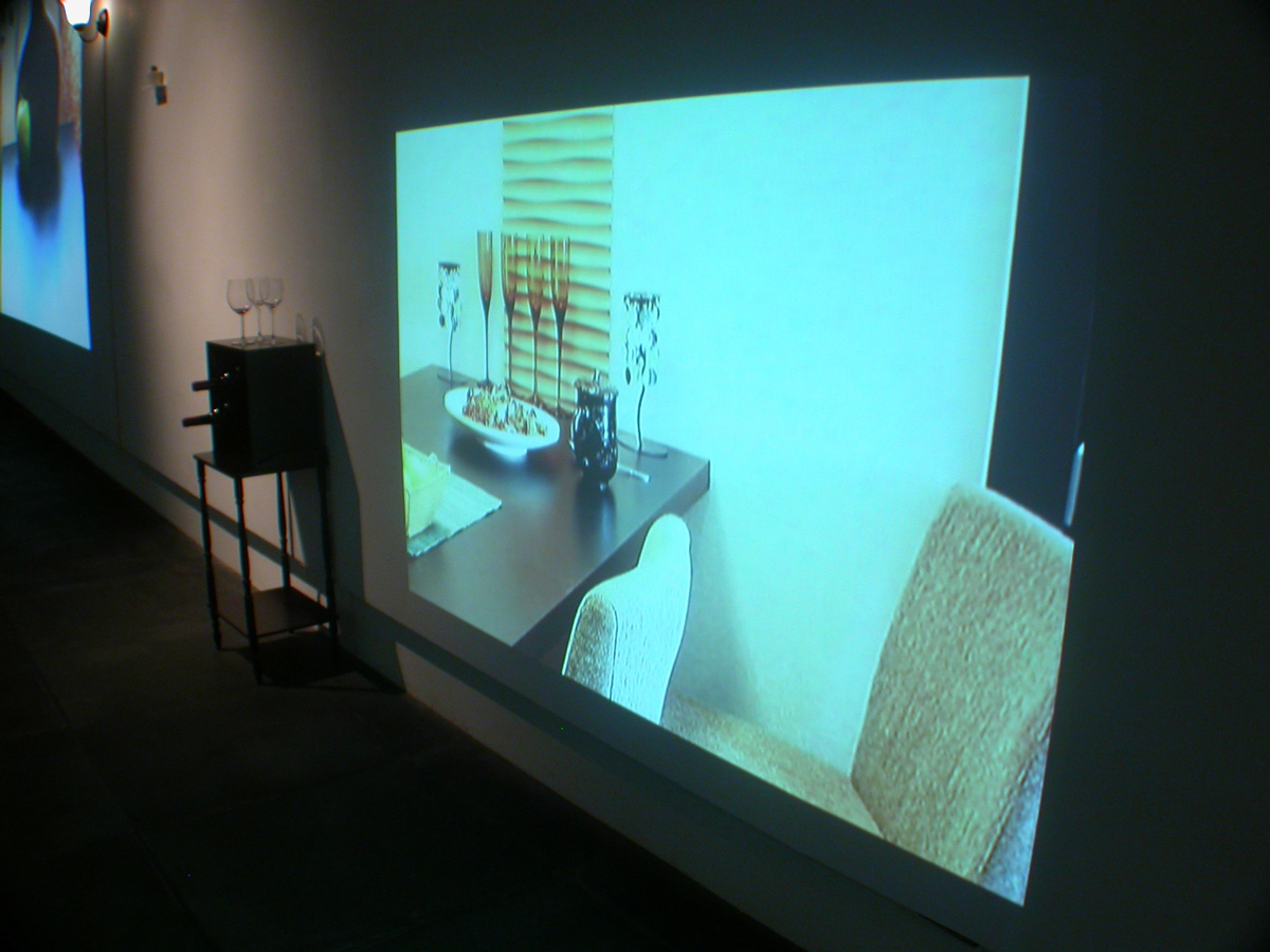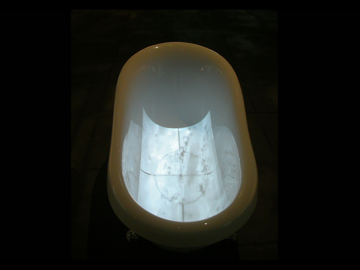Six projectors and two small TV sets displayed eight short video clips of model houses and their perfectly pristine interiors. One projection filled the empty bathtub that stood in the center of the space. The flickering images of the dream home are then juxtaposed with actual war images from Iraq; the tranquility of the perfect home is thus shattered by the gruesomeness of the outside world. While watching the images, viewers will also hear the songs of Jihad from Islamic countries. This combination of the banal with the tragic and the dream world mixed with the harsh reality is the flashover point.
