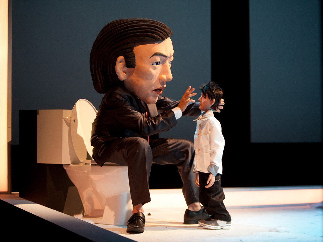 The minimal stage design uses a toilet as the main setting, as the lead character often contemplates life in the bathroom. Since the puppets are modeled after the actor’s face, they all resemble Derrick Wei which creates an ironic contrast. With the volatile play of intentions of the actor, this performance presents a powerful tension on stage that cannot be replaced by other artistic forms. For example, the interviewees mimicked by the ghostwriter through narration are recreated as puppet characters of diverse materials and shapes with distinctive characteristics.