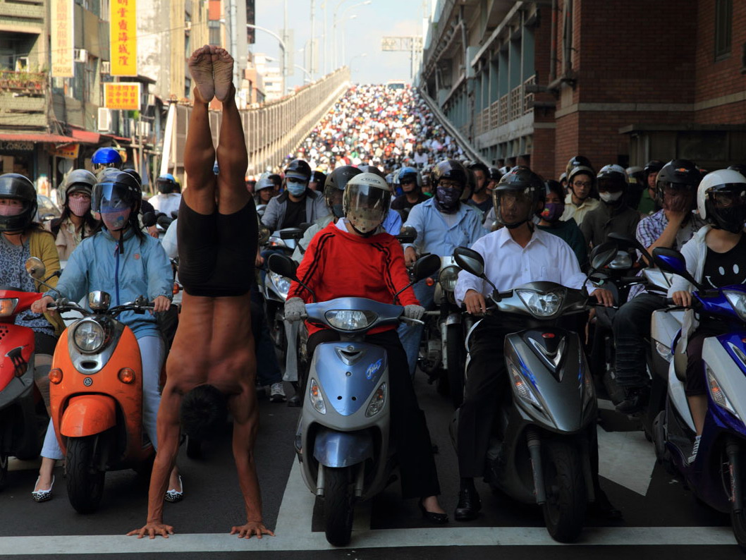 During the trip, he performed a 70-minute work on the street, after he had researched the location and the local people. After the performance, he would do a headstand at a street corner or on a motorbike and capture the moment in a photograph.