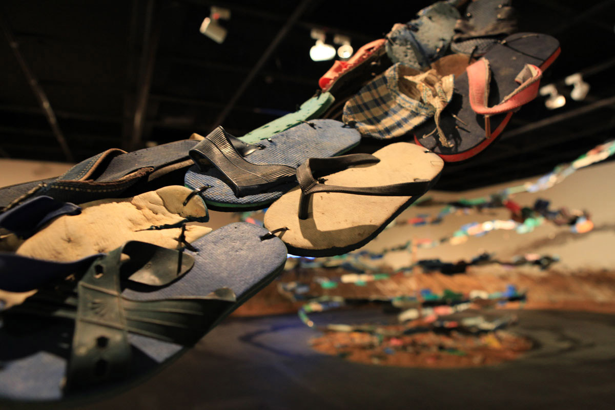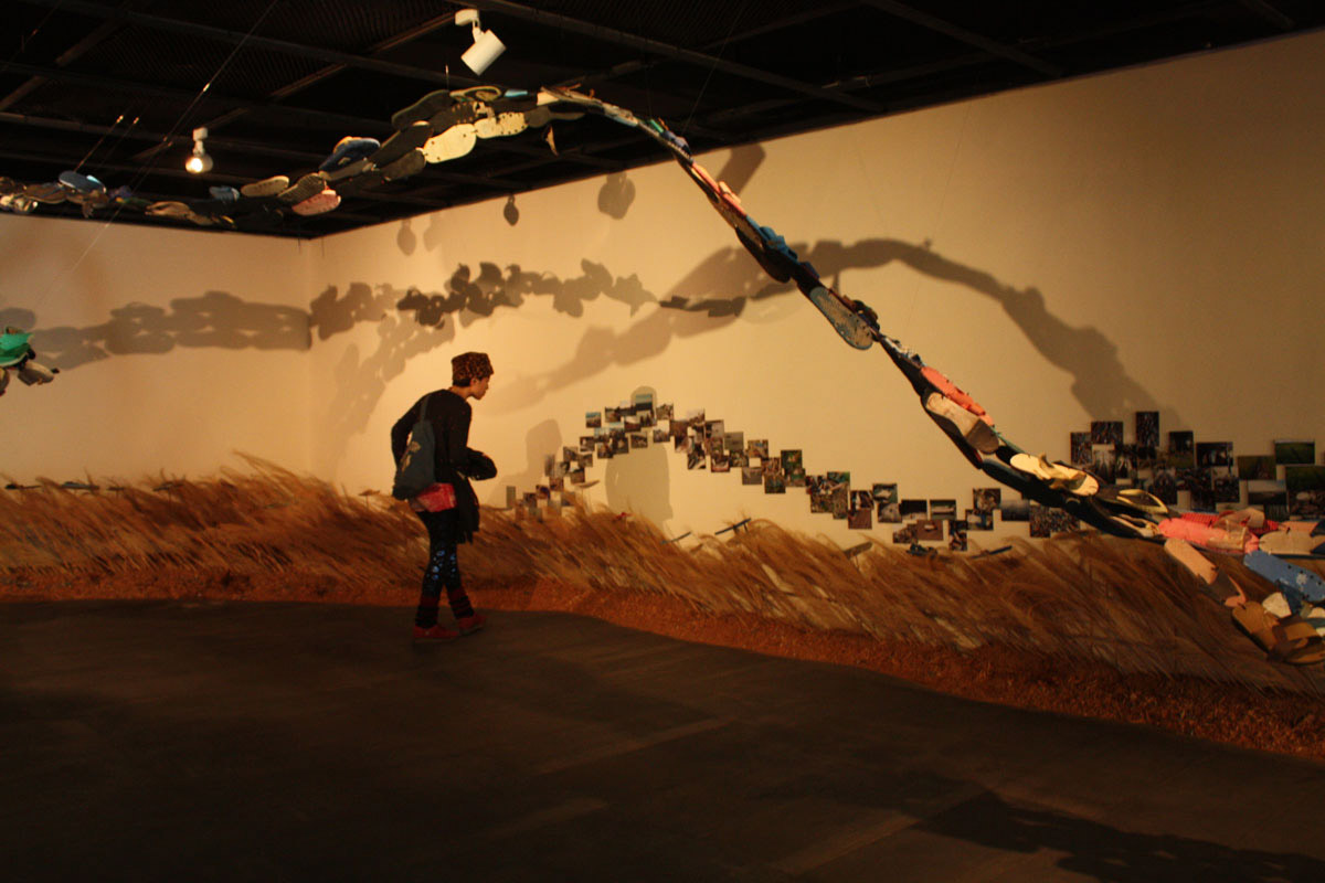 For his installation he used driftwood and rubber slippers as in those impoverished days of his childhood, the tribe relied on the floating animals, pieces of driftwood and rubber slippers that washed up on the shore from a typhoon. In the exhibition space, hundreds of rubber slippers were suspended in a vortex over a wasted landscape. A video filmed on the shore of Zengwun River, Tainan showed the artist cutting a trail through an overgrown field of Miscanthus.