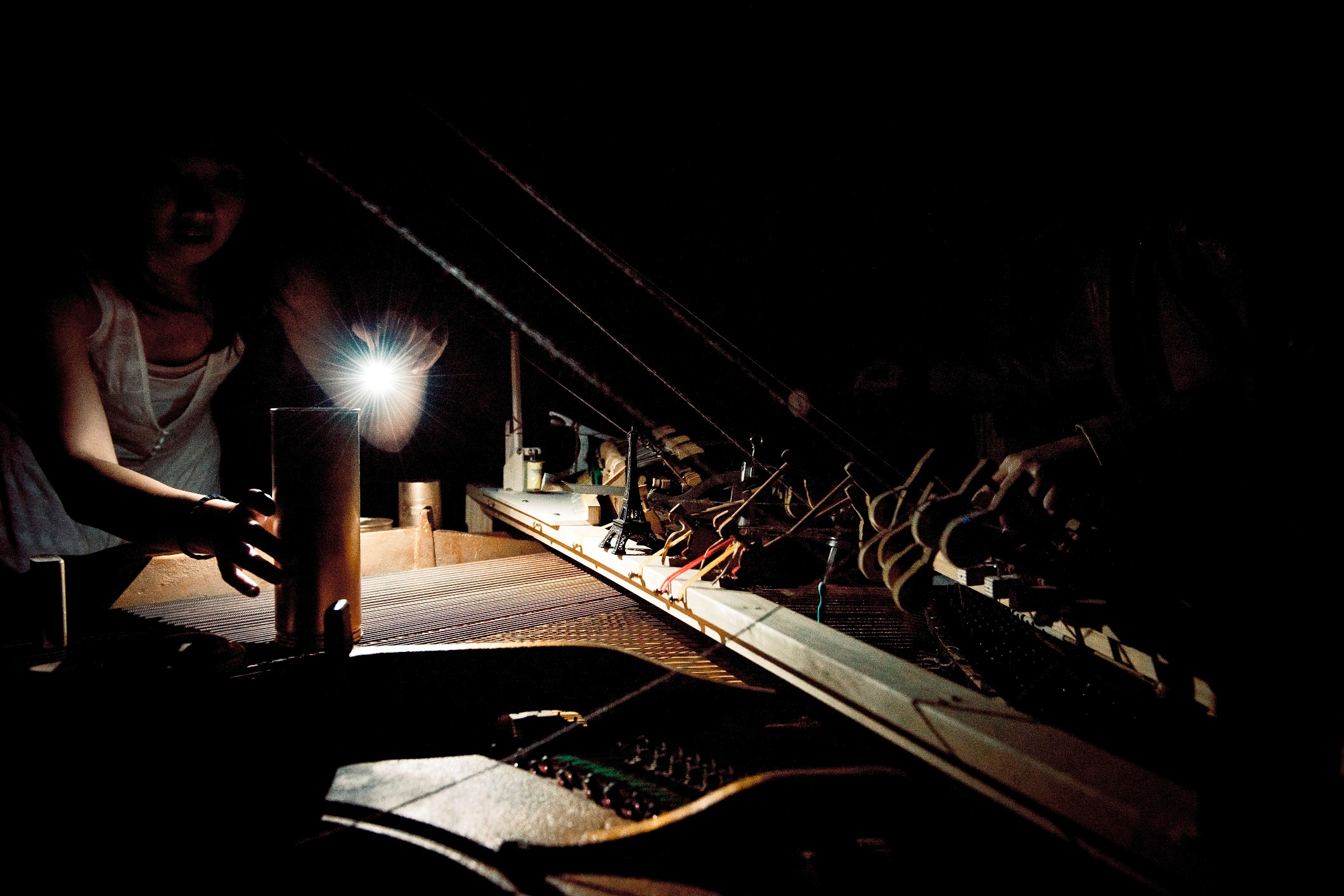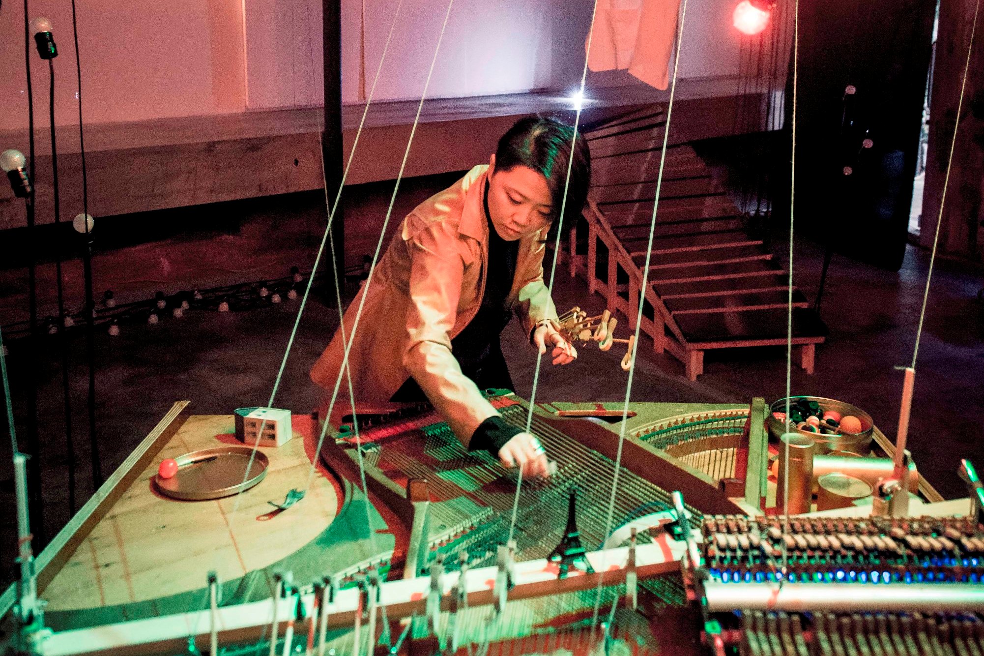 Attempting to channel the spirit of American avant-garde composer John Cage, three artists from different fields collaboratively create a playful performance piece by means of "deconstructing, questioning, and discovering." Kinetic installation artist WANG Chung-Kun deconstructed an upright piano, tears apart the keyboards as well as the hammers from the body of the piano, and reconstructed them into a new form of instrument, in which the hammers are connected with cotton threads, and extended by the body of the dancer, allowing choreographer TUNG I-Fen to make sounds with her body. Composer LIN Kuei-Ju utilizes various percussion mallets and everyday objects (e.g., bouncing ball, stones, pots, metal plates, and ping-pong balls) directly on the strings of the piano while Wang used mechanized devices to turn the piano into an instrument with endless possibilities of new timbers.