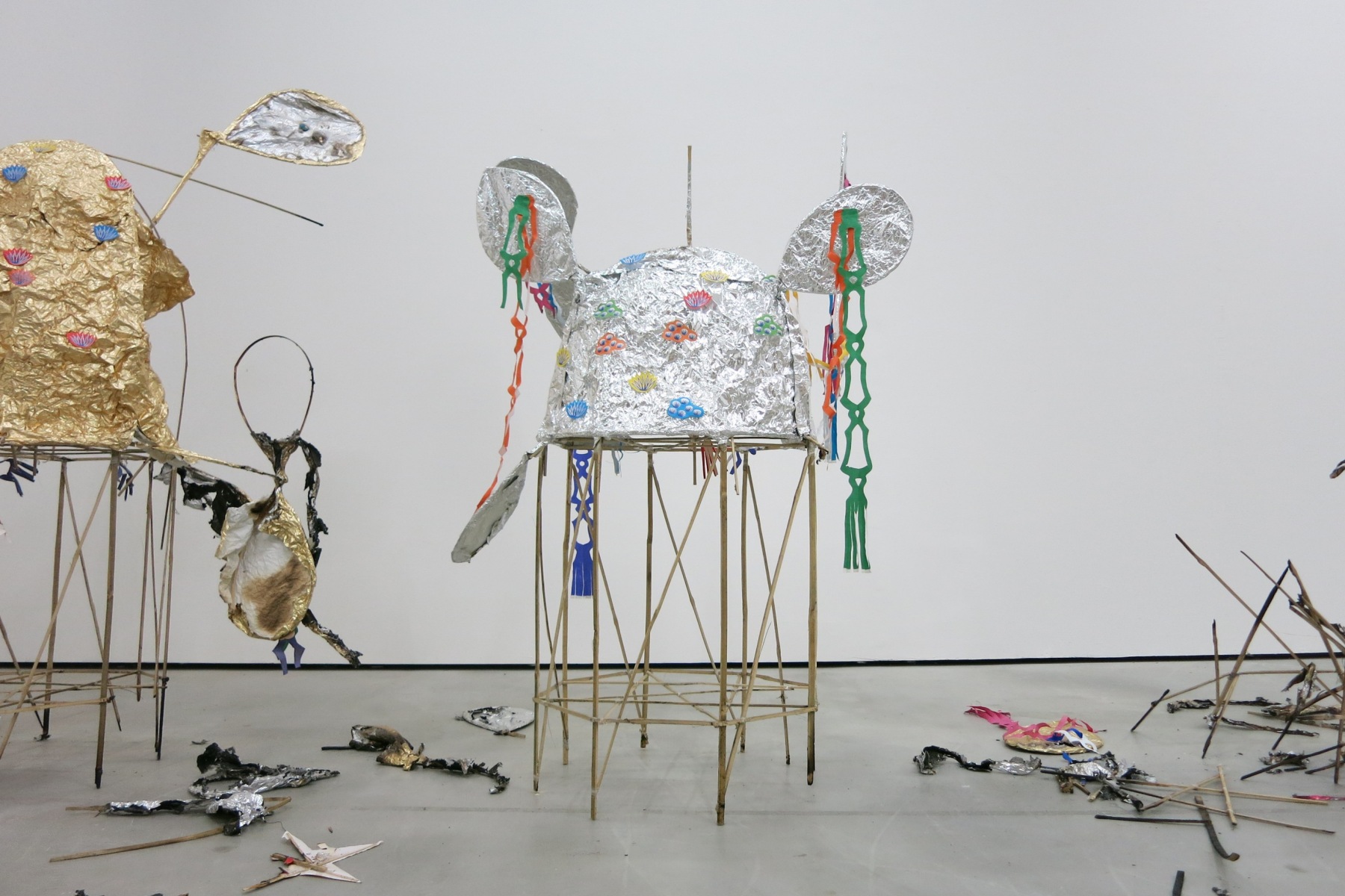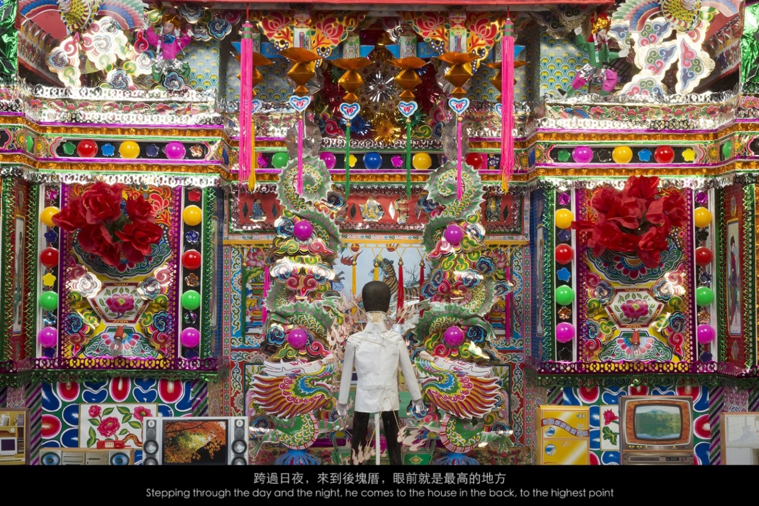 Hua-Shan-Qiang applies existing mediums (sculpture, photograph, video) to the traditional culture of paper offerings to create a combination of form and symbolism in which the two serve to complement one another. The new work Hua-Shan-Qiang centers around the story of a man who died in the act of self-immolation, who enters the underworld as a spirit. In accordance with traditional custom, he arrives at a house made of a paper offering and ascends to overlook all of his fortunes. In the process, his spirit passes through the vestiges of the Ming Dynasty, the Qing Dynasty, the Dutch occupation, the Spanish occupation, the Japanese occupation, Kuomintang, and capitalist colonialism.
