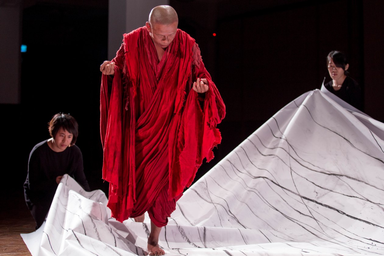 With minimalist staging, color, and theatrical elements, The Monk from Tang Dynasty gradually unfurls the virtual and the real, and reveals their infinite conversions within nothingness. The artist is physically present to paint on site, using different tactile symbols to highlight the material structure of graphite and paper. The meditator is physically present to meditate on site, opposing the quotidian with the impermanent, and successfully demonstrating the passage of time in the silence of the theater space. This theater performance showcases TSAI Ming-liang’s signature slow, nostalgic style that presents a highly magical “reality” and a sensitive “real(time)ism” through an approach closest to “actuality.” The work brings in the element of paper that can be painted on, sat on, folded into a futon, or crinkled to resemble mountain peaks – imbuing paper with the endless possibilities of contemporary manifold perceptual space.