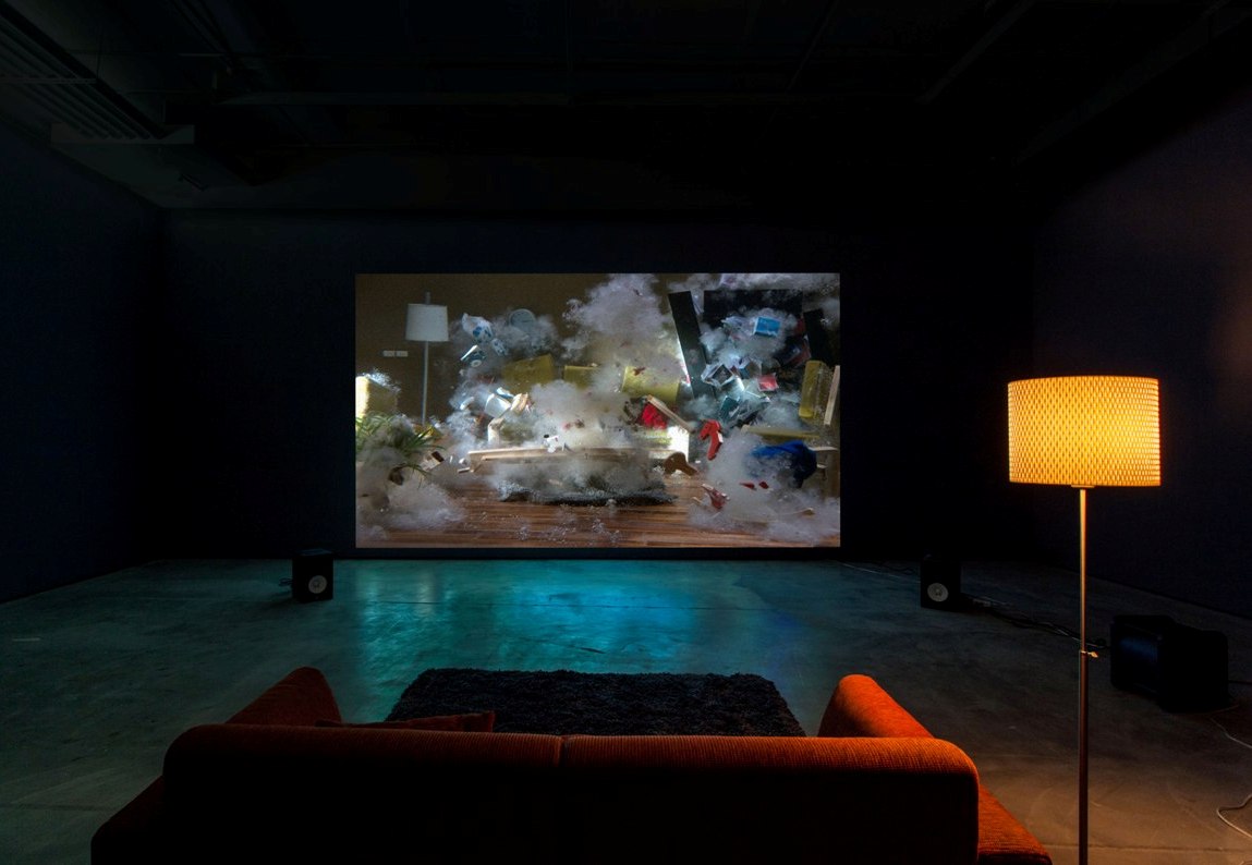 The looping video, Dwelling, presents an IKEA-style living room of a bourgeois household. From an unforeseen explosion, one suddenly realizes it is an underwater scene. While the blast symbolizes “destruction” as well as “rebirth,” it also refers to the safest haven of human beings, “the amniotic fluid of a mother’s womb.” The title of this work is inspired by the 1951 speech, “…Poetically Man Dwells…,” given by the German philosopher, Martin Heidegger (1889-1976), in which he expressed his reflection on technology and awe of nature, honoring a harmonious, co-existing state of the sky, the earth, the divinities and the mortals. However, when reviewing the normal conditions in modern reality, it is simply “difficult to dwell poetically.”