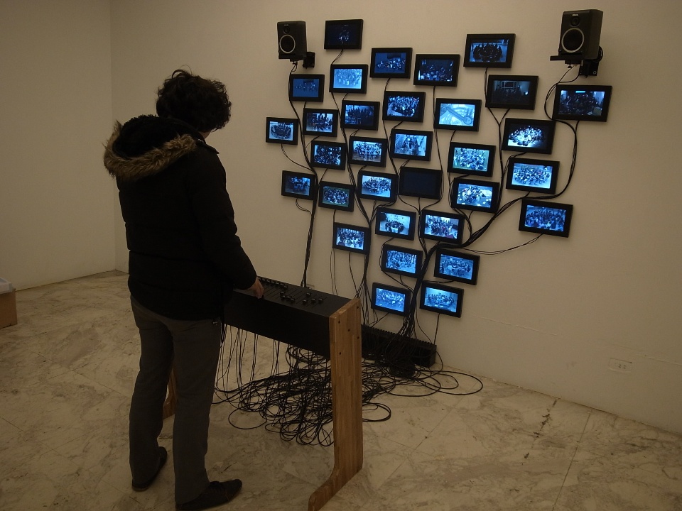 Sound Intestine Mixer 2004-2013 is a ten-year conclusion of the Tape Music project. From more than fifty recorded performances, the artist selected thirty-two performances filmed from a similar angle, and showed them on thirty-two digital photo frames at the same time. The audience could not only watch all the interpretations of the “sound intestine” by different groups, but also operate a mixing console to manipulate the sound tracks. In the exhibition, in addition to the two installations described above, a range of archives related to the project was shown, including the artist’s notes, sketch drawings, performance photos, and the master tapes.