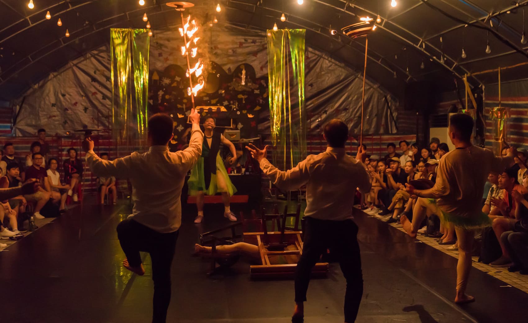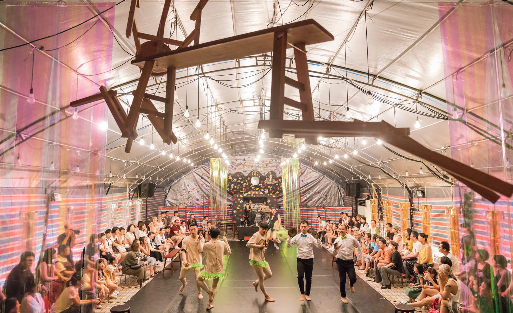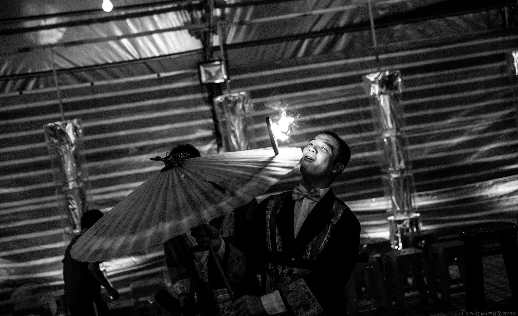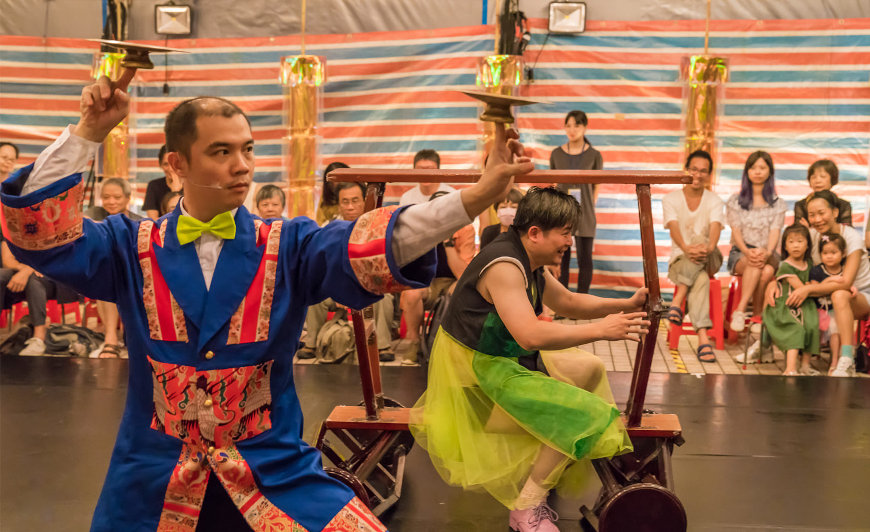 This new work created after two years of field research about folk culture attempts to incorporate the distinctive “Nong Nao” acrobatic performance typically performed in Taiwanese funeral rites into circus performance, displaying an acrobatic language and body characteristics informed by both the traditional and contemporary spirit. The mesmerizing performance of crotales (small cymbal) and fireball in funeral rites often play a role of diluting the sorrow with laughter, entertaining the spirits as well as the living. The director refined the symbolism of objects and the implications of rituals before integrating them into the modern performance. A tri-colored Taiwanese-style tent was put up outside the National Theatre & Concert Hall, decorated with the multi-colored paper craftwork of Hsin Hsin Joss Paper. In addition, real practicing shamans were invited to join the performance, bringing a mélange of humor and fluidly arranged music that enlivened the live scene. The audience sipped wine while enjoying the performance, taking part in a liminal atmosphere with alternating somber and boisterous rhythms to witness the transitioning of the transient life. Blending religious rituals and live acrobatic performance, the work ferried the melancholic burden of collective sorrow to the other shore with a lighthearted mambo, unfolding an alternative soul-liberating ceremony with much therapeutic effect.