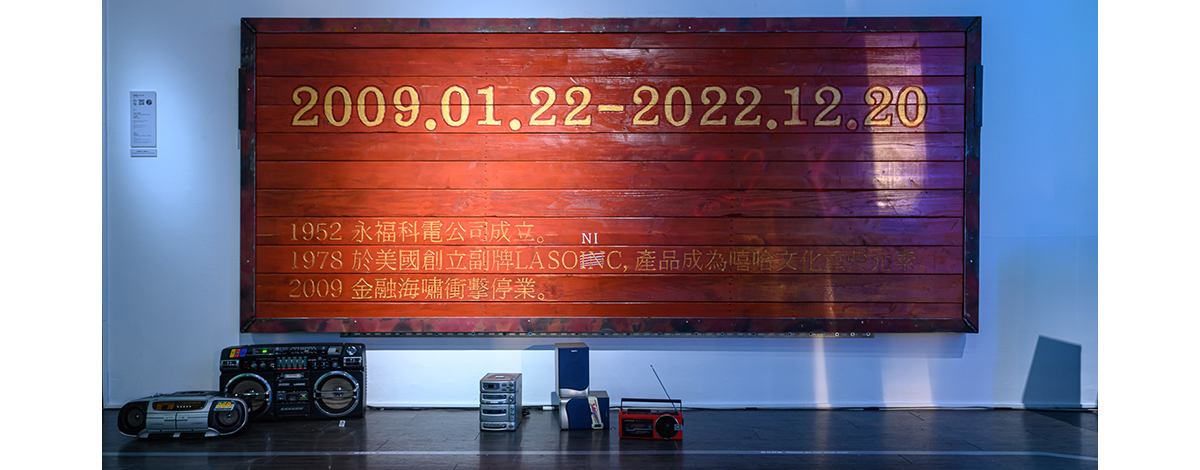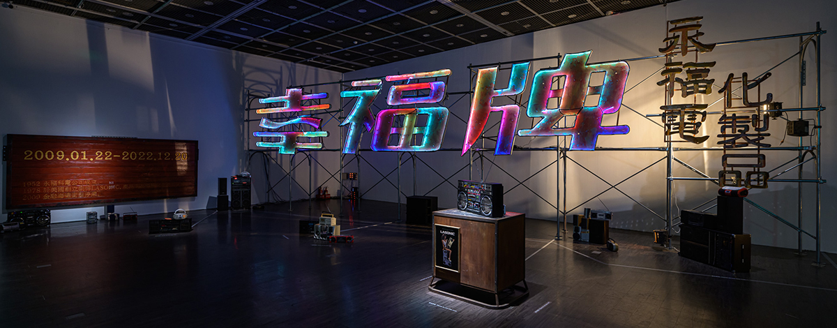 TSAI Pou-Ching and LI Cheng-Liang dismantled an old signboard of “Lucky” from around the Tainan Train Station and exhibited it in the exhibition, Signal Z. The LED installation emits iridescent colors regularly and includes “Lucky” stereo sets collected from various channels that broadcast sounds and music arranged by FENG Zi-Ming. The newly arranged renditions of old popular songs alter the ambiance around objects and the quality of the space. The work revolves around the financial crisis in 2009 thematically, which is not only a revisit to the news event but also an archaeological attempt to investigate the body that resonates with broadcast media and music, as well as the life memories of many people. Linking the old “Lucky” signboard from a real landscape with a traumatic history involving the development of Taiwan’s industry, the work re-evaluates historical remnants through a contemporary perspective and releases a force of nostalgically charged sensibility that utters an active meaning of this era. (Commentator: CHEN Kuan-Yu)
