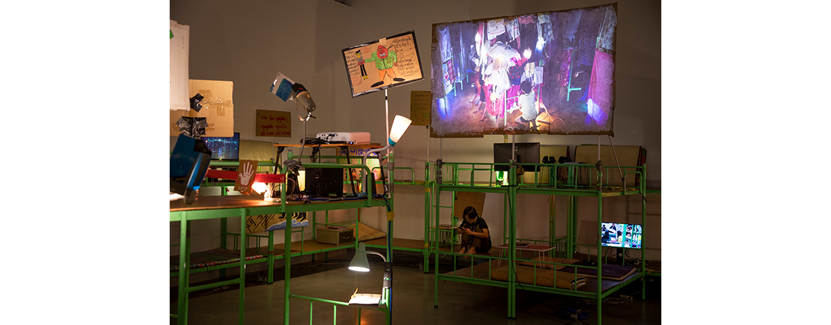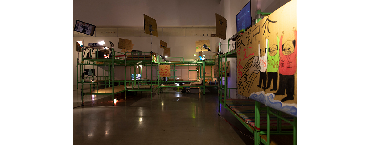 The practice of Your Bros. Filmmaking Group has long engaged in issues related to laborers and transnational migrant workers in contemporary times. Through open calls for performers, ongoing private book readings, and workshops, their work embodies the idea of decentralization and engages collaborators in extensive discussion and sharing sessions to slowly co-create the narrative texts of videos and films. This work builds upon their previous film, titled Ký Túc Xá(Dorm), and converts concerned topics, co-created materials, and unfilmed sites into a spatial installation. The characters in the previous film are also turned into those working behind the camera to further extend the team’s work processes into a dual scene through a plastic approach, which can be both read and perceived in the same space by the audience. (Commentator: LIN Yi-Hsiu)