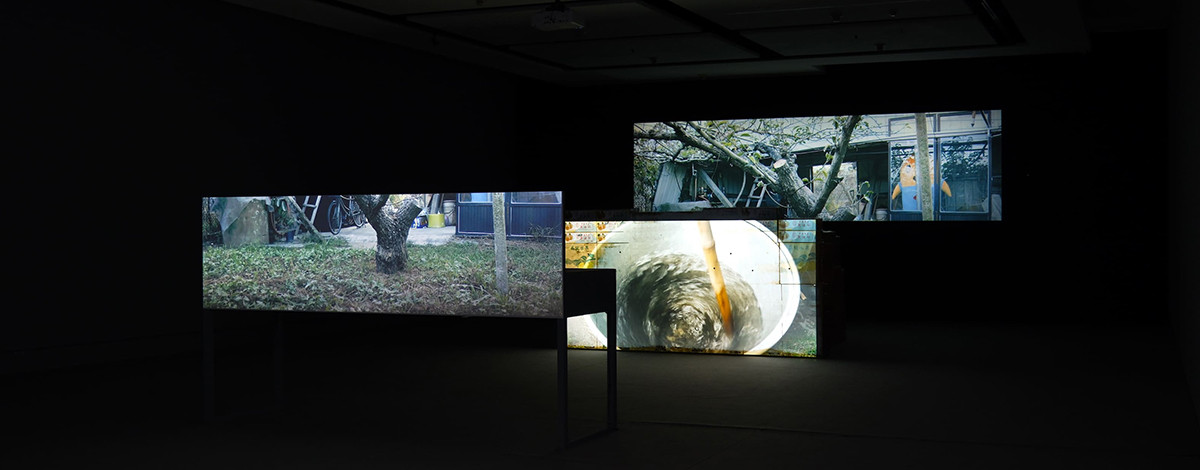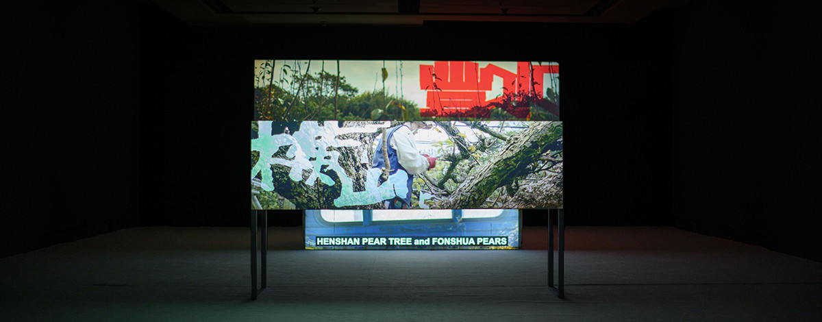 Hensan Pear Trees & Hosui Pears is a three-channel video that reimagines the intricate and time-consuming cultivation methods employed by Taiwanese pear farmers. Displayed as a triptych from a single-point perspective, the piece reconstructs elements of the sky, land, sounds, and human activities across three synchronized screens. As a video installation, it reflects the techniques pear farmers use to align the diverse seasonal cycles of various pear varieties. The film begins in autumn with soil preparation and tree protection, progresses through the labor-intensive winter of flower bud pruning and grafting, transitions into spring with fruit growth, and culminates in the summer harvest. While the video may appear documentary-like, it is transformed through the viewer’s bodily awareness.