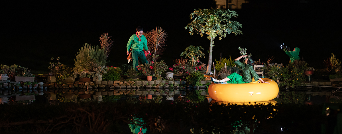 This exuberantly fabular creation by HSU Peng and her young wacky collaborators, “flowers bloom on the dead end,” literally takes over her sprawling ancestral courtyard house in remote Guoling of Zhongli District, and breaths new and radical life into the domestic household - once constricted by the patriarchy of Hakka culture - by re-imagining the lived experiences of its women inhabitants, emancipating their sedimented voices and emotional world. By inventing a hyperbolic acting technique (filled with trivia, mundane, non-stop and desultory dialogue and musical punctuations) and a 𝘱𝘢𝘳𝘤𝘰𝘶𝘳𝘴 of the derelict architecture, the work produces a madcap process of both alienation and engagement for the characters and audience, at once funny yet robustly vernacular. Life and death in a Hakka family undergoes subversive episodes of a queer romance staged in the ancestral hall, a transversal romp of culinary-human-animal enactments, and a portrait of intergenerational bonds that transcend species!