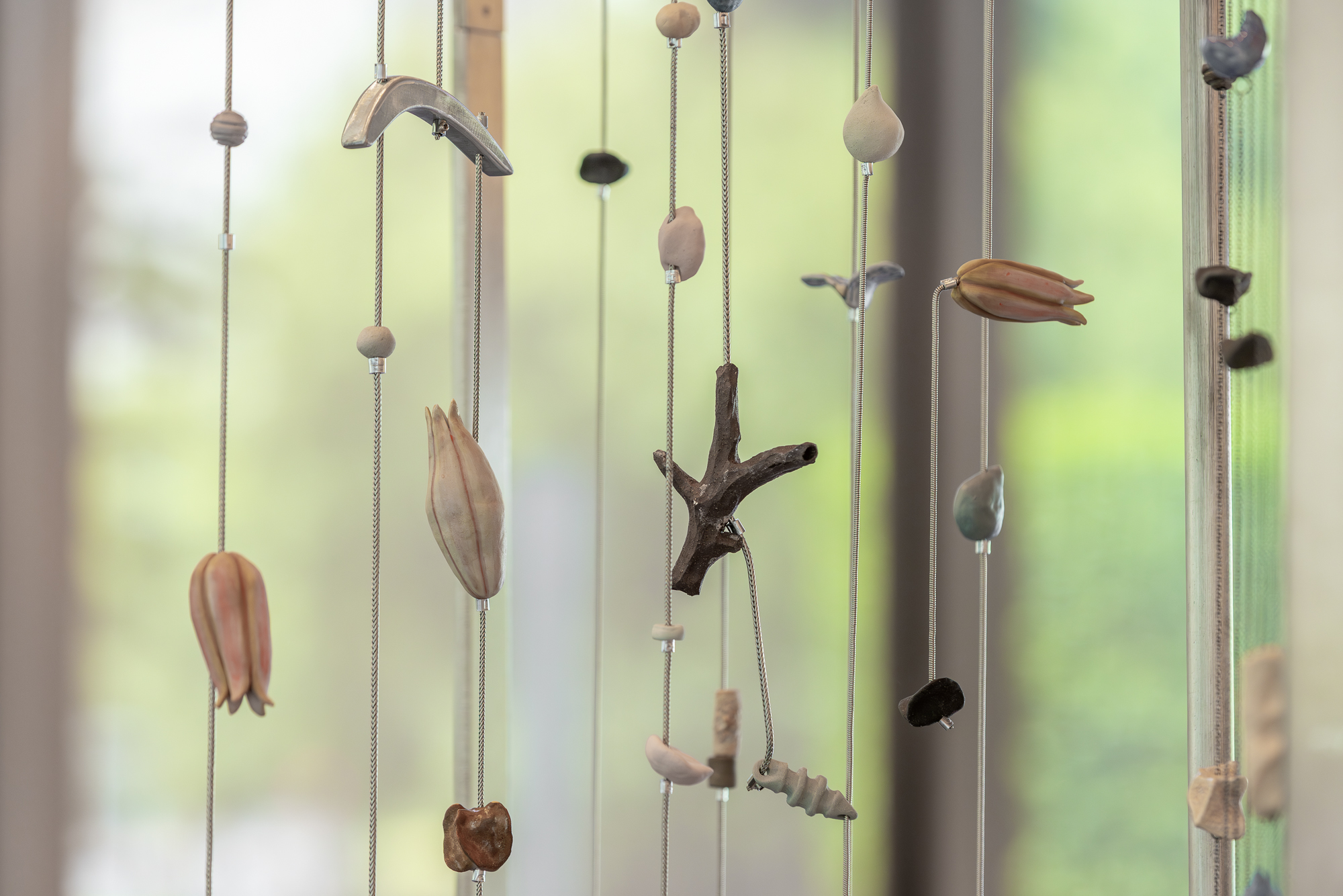 YANG Chi-Chuan was born in 1985 in Taipei, where she currently lives. Her work is characterized by a delicate quality linked to memory and explores the complex relationships among people, places, objects, and events. Recently, she has focused on the materiality of handcrafted ceramics by suspending many self-fired ceramic pieces in tree-like or spatially expansive structures. Using mechanical devices that rotate or sway, these pieces become “wind chime” installations that produce gentle sounds. These wind chime installations embody elements from Yang’s decade-long artistic journey, representing her ongoing exploration of personal experience, natural environment, architectural space, memory, sound, ruins, performativity, organic forms, and non-readymade objects.