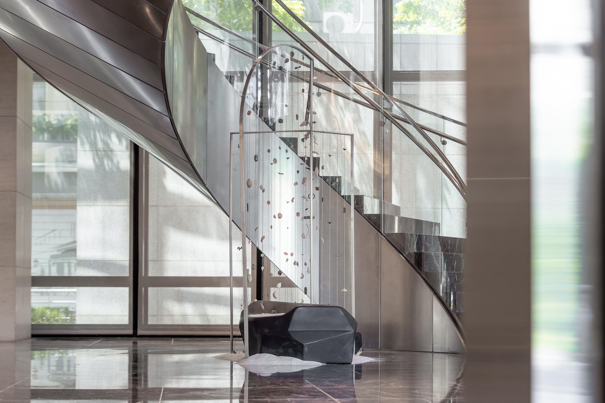 This exhibition features Turning into Autumn, inspired by hiking through deciduous forests in the mountains, and Things Turn into Stones, Stones Turn into Sand, an allegorical piece made from coral bones and plastic debris commonly found by the sea, along with a newly crafted small wind chime. The artist uses permeable structures shaped like doors and screens to display these suspended artworks while introducing new forms and viewing perspectives. The arrangement guides the audience through five sensory segments and experiences by a riverbank—leaves falling near the water, stones resting among ripples, dust floating in sunlight, flowers and trees swaying in the breeze—shown from close and distant viewpoints to depict moments of walking along a river.