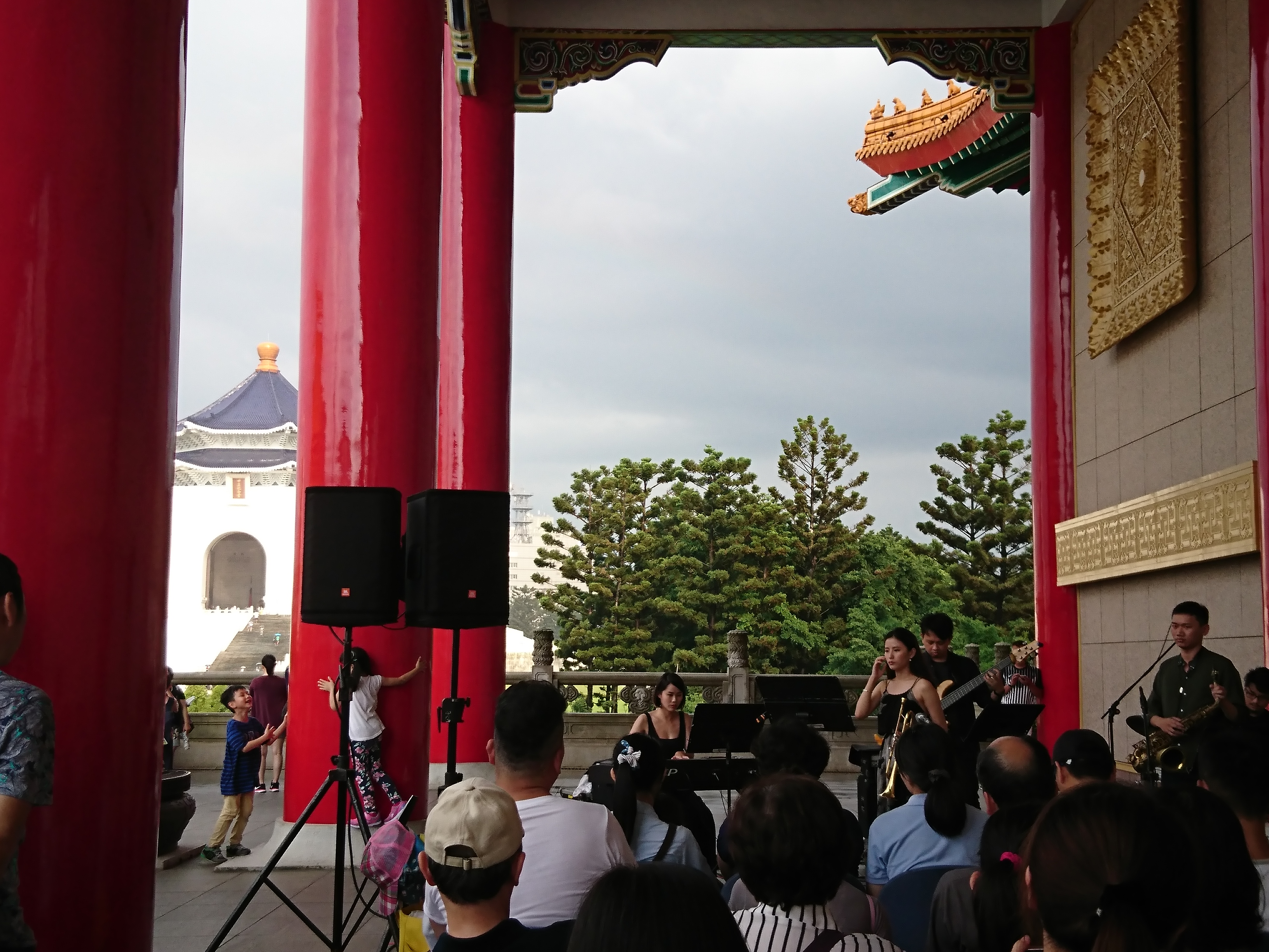 這次兩廳院規劃的打開劇院大門活動,不僅僅只有後台導覽活動、還有舞台燈光秀、兩廳院爵士音樂菁英樂團、小木頭奧勒岡的奇幻歷險記、微型音樂舞蹈演出、Open 市集等,在等待舞台燈光秀開演前,走到面向藝文廣場的平台上聆聽兩廳院爵士音樂菁英樂團的演出,從巴薩諾瓦到搖滾,在淅瀝的雨聲中享受爵士音樂,背景則是點綴著淺色彩虹橋的中正紀念堂,有種愜意午後的閒適。