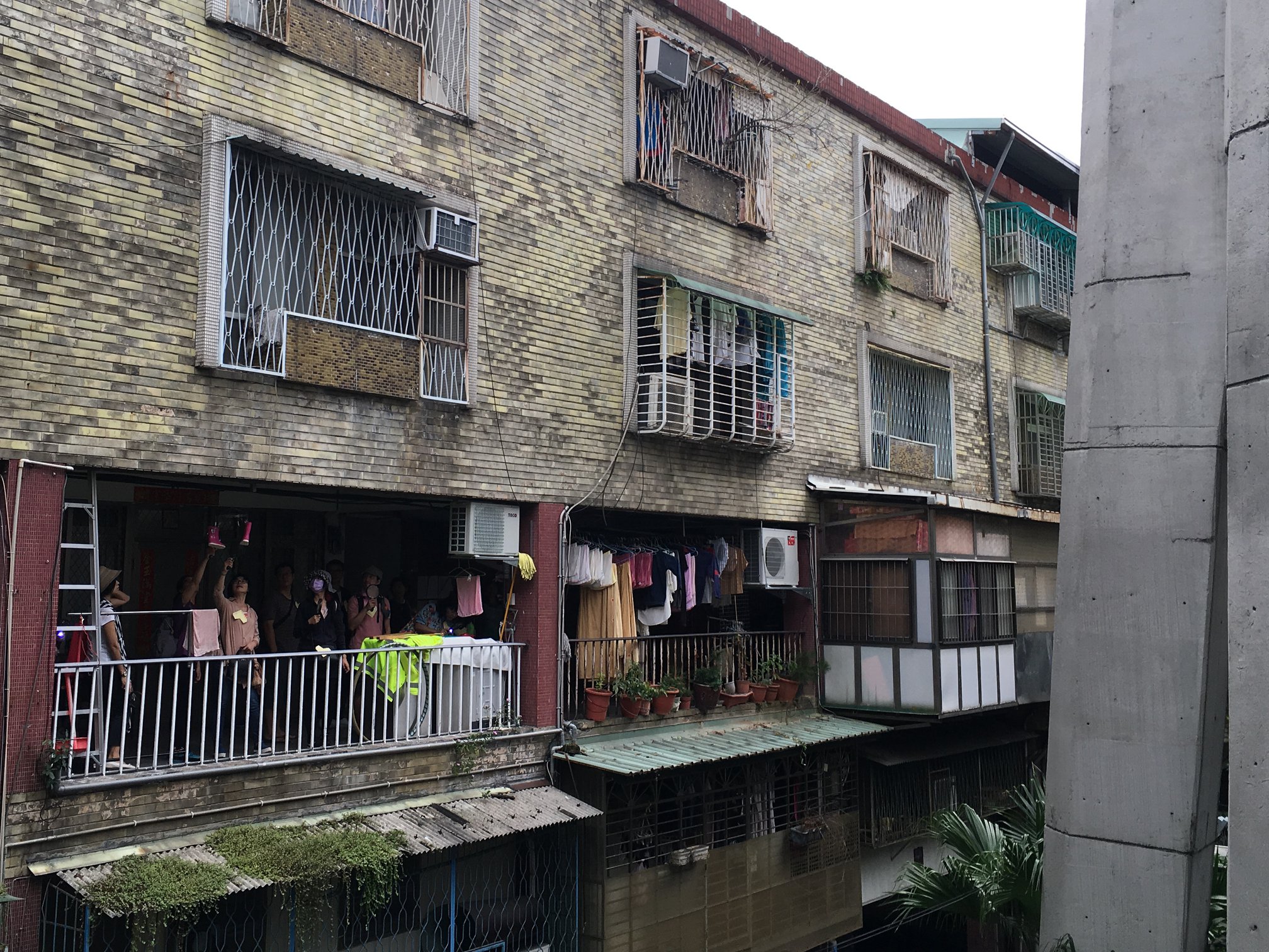 第二站「華江新市鎮天上人間」,華江整宅是由16棟四層樓高的建築,總共有4000多戶,彼此雖獨立,不過每棟皆由天橋連結,形成個環環相扣的結構,由於是開放的空間,感受到社區的複雜性。我們分成兩組尋找騎樓間的一位「紅白橫條衣服的小人」,途中有不同的「小人」,每個「小人」都是曾經或目前的住戶,有著兒時在華江整宅回憶的故事,在騎樓上曬衣服、玩捉迷藏等等,走進社區中彷彿進入迷宮裏,令人目眩神迷。整宅是否應參與都更,亦或將特殊的建築設計好好留存,值得我們去深思。