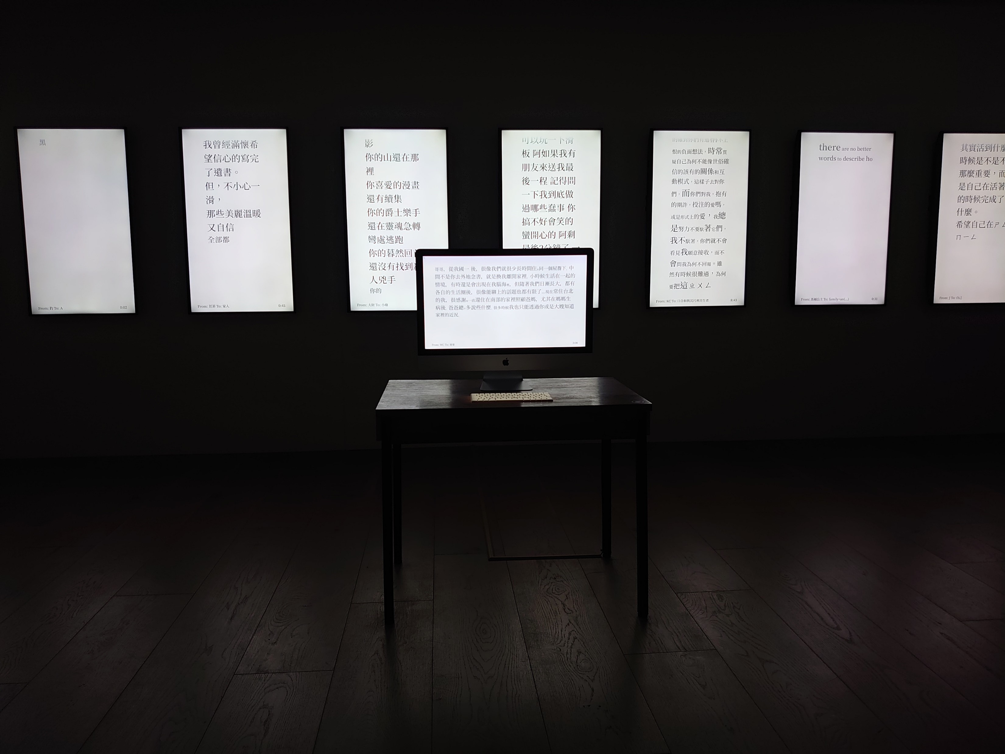 其它的作品也十分有趣,例如在無人操作的鍵盤不斷空氣打字的《遺書/輸入的痕跡》,在光源為電腦螢幕的漆黑的房間看到這些,一開始視覺的詭異,後來卻覺得有些鼻酸感傷,最後覺得如果在生命結束之前,自己也能有平靜的時刻好好地留下對家人、親友、世界一些片段訊息,也透過這套由藝術家研發的「輸入的痕跡」(TypeTrace)軟體,讓「後來」的人們看見自己寫這段文章用字遣詞及敲打文字的時光。