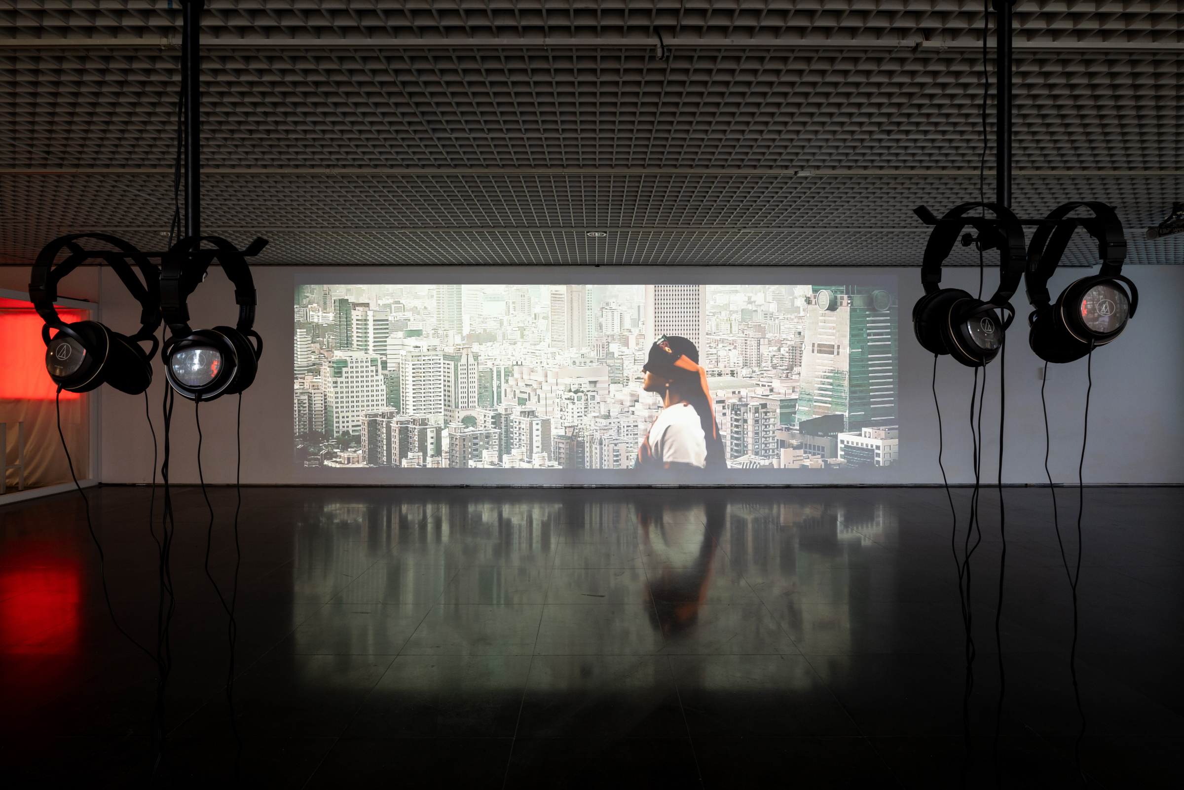 導覽結束後,當日的人潮逐漸緩褪,我仍在北師美術館流連忘返。在二樓的碧斯蔚‧梓佑/UTUX泛靈樂舞聚會所《遺忘的奧秘》前戴上耳機,把自己的耳朵浸入了原住民空靈的歌聲中,再把眼睛深入放進影像裡,像站在細軟淺灘上望著自己被海浪沖刷的腳丫子,享受著流動畫面帶給自己的動態錯覺。車流、河流不斷交錯並朝著身體沖刷而來,浮現曾經站在和平東路綠色口字型天橋上、某郊區吊橋上往下望車流、河流朝自己衝來的畫面。我在時空交錯的錯覺中、在藝術家提醒閉上眼睛、放大其他感官的嚶嚶聲中;享受著、休息著。