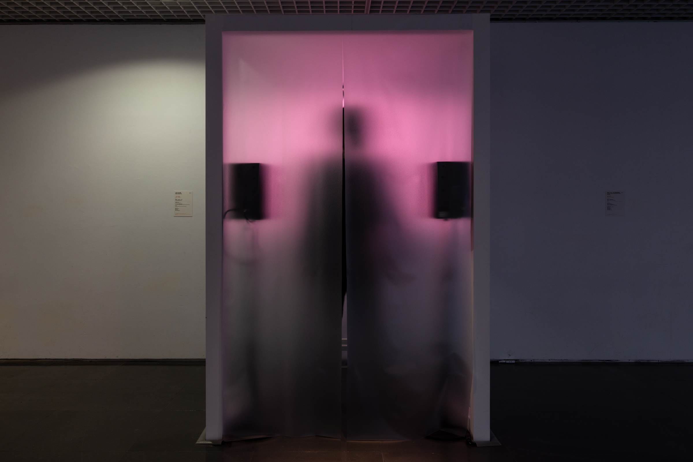 《群眾》在熙熙攘攘的吵雜聲中,與禁錮在霧面空間裡的你相呼應著,在沸沸揚揚的社會裡,其實劃分不了一個人的隔離與群體的躁動。