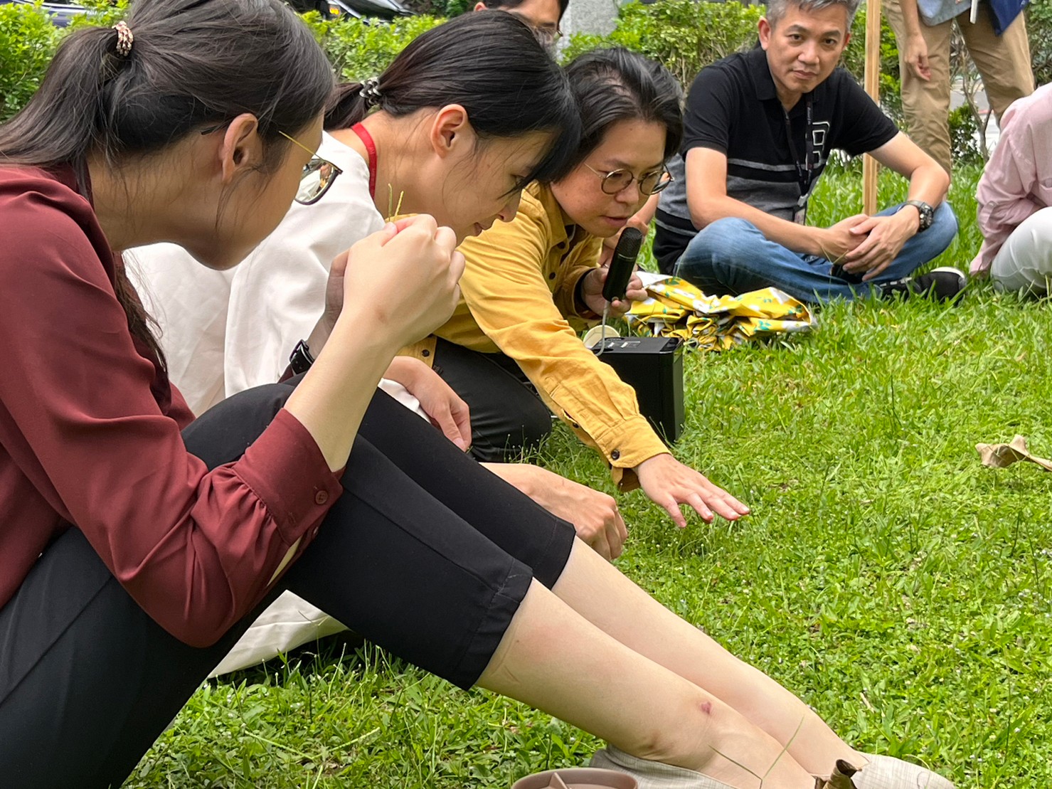 除了欣賞老師們的作品,我們也實際到認養的場地進行一場午間深呼吸體驗。即使正中午陽光有些毒辣,但在草地上一點卻不覺得熱。反而有種在午休時光強制按下暫停鍵、只要專注於當下的自己與呼吸的輕鬆感:放空腦袋、放鬆身體、回歸自己。