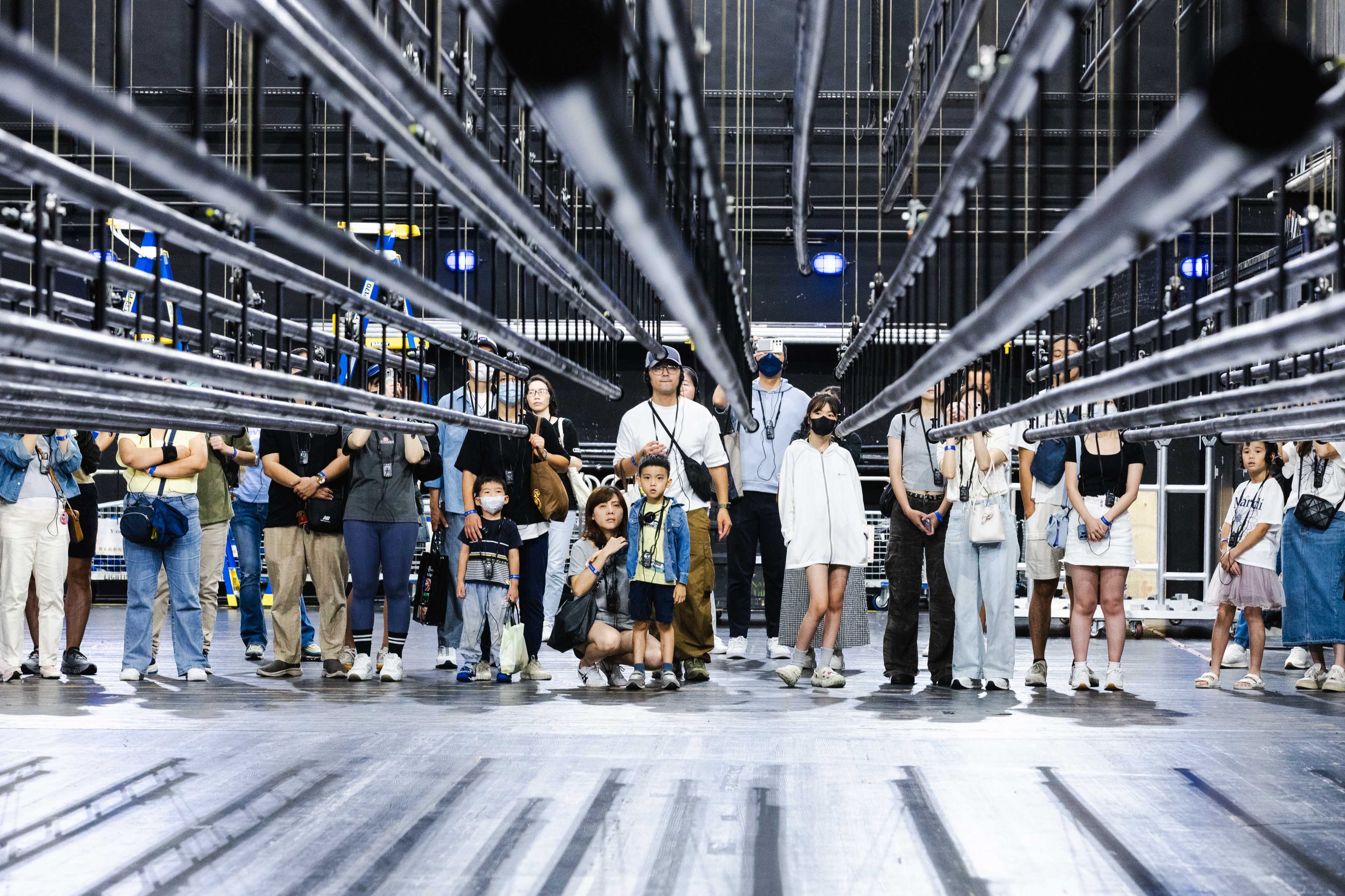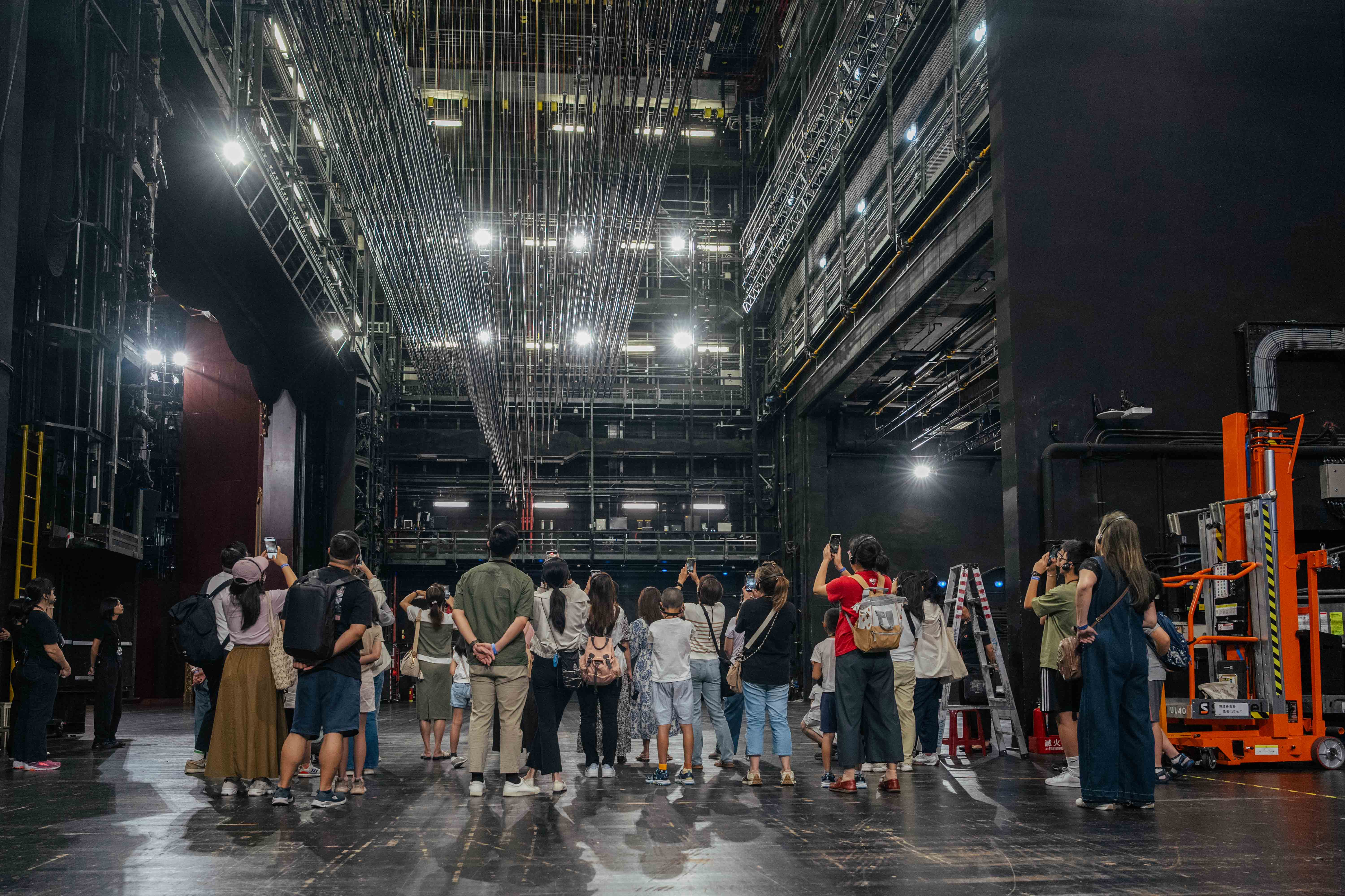 而直到踏上國家戲劇院的舞台,我們才真正感受到「幕後的世界」有多驚人。舞台上方是密密麻麻的機械設備,無論是手動操作,或電腦化控制,都藏著技術與精準。看著工作人員操控這些吊在天花板上的道具桿,排列幻化出不同形狀,想像著搭配演員與配樂,又是一齣好戲!讓大家都驚嘆連連!
