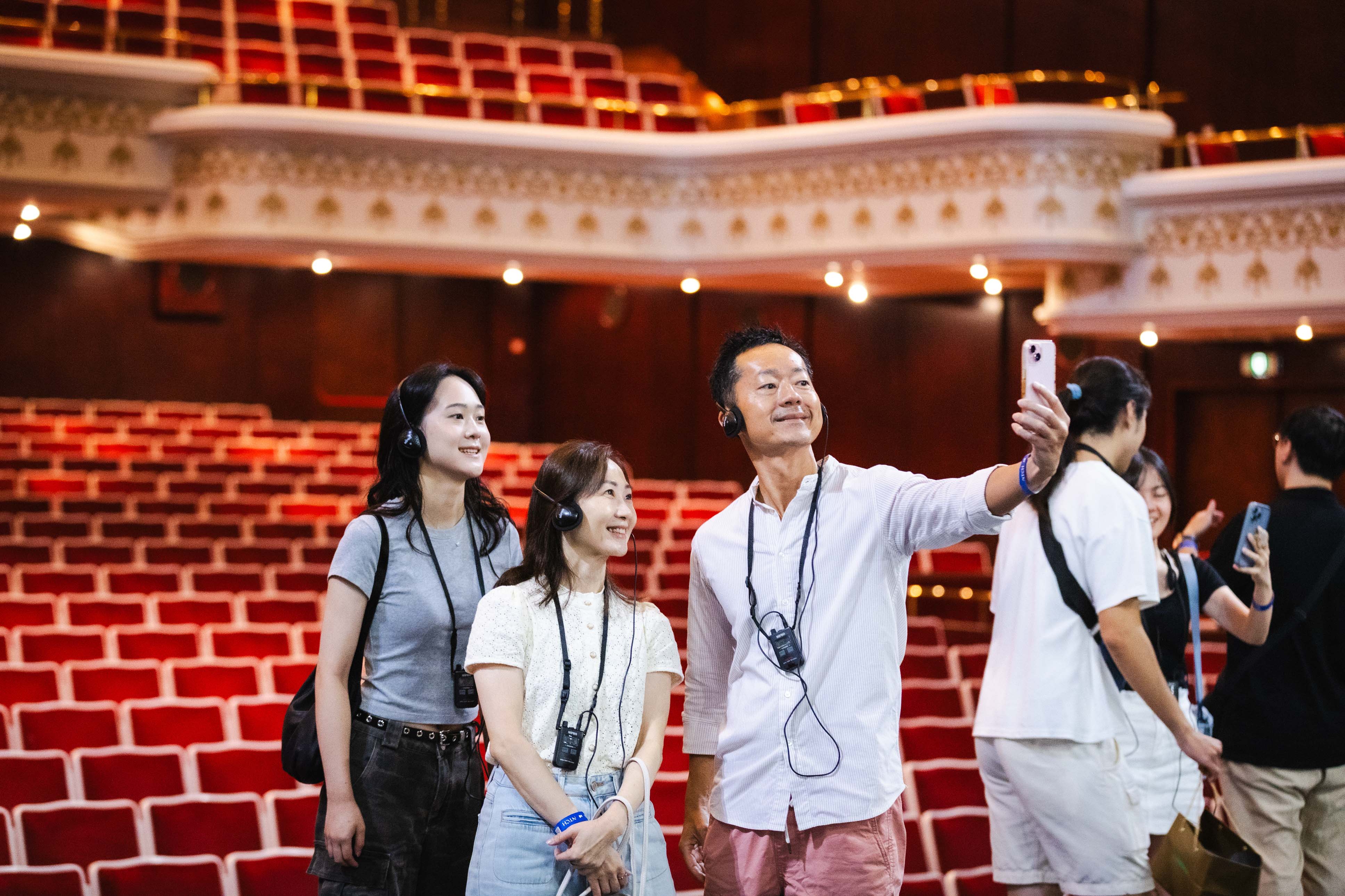 活動開始時,每人配戴耳機導覽設備,讓我們即使在寬敞的空間中也能清楚聽見導覽員的講解。首先參觀的是卸貨通道與地墊室,這些平時觀眾看不見的區域,其實是每場演出能順利進行的關鍵。接著我們走進布幕室與演員化妝室,裡面設備齊全、燈光明亮,可以想見演員在這裡做準備的情景。縫衣室與洗衣間的設計更讓我驚訝,衣物清洗與修補等需求都有完整的專業設備支援,足見舞台上每個細節都不馬虎,力求舞台效果的完美與極致。