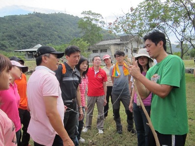 藝術基金會這次為台新員工在南澳辦理了深度的獵人學校體驗課程,參加的成員在南澳車站集合就有震撼教育,五輛一字排開的藍色發財車殺氣騰騰的 ”上車!” 酷似電影明星的韋文豪老師是泰雅族原住民,挺拔的身材,雕像般的側臉,但有時又是風趣的談笑,站在車斗上指揮的氣勢真是迷死人了! 風馳電掣的衝鋒我們到了今天的課程場地―武塔國小。這地名在學生時期總覺得既偏遠又神秘,如今身歷其境又覺得是一個精緻的小學校,每班人數都不超過六人,我們在執行長宣佈活動開始後分組進行原住民的獵人技能實習。要怎麼設陷阱抓山豬呢? 必須要有一條鐵索,一根小樹枝和一片木板。要是山豬走過這陷阱就會被鐵索圈起來動彈不得了。據說有時候獵物太大鐵索還要用上三條才頂的住! 另外老師也和大家傳授野外求生秘訣,就是要帶個打火機,一些鹽,一把好用的刀就可以在山林裡提高存活率了。