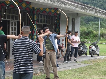 用完暗招也要學習正面對決,這次教導我們的是當地的扛霸子,武裝勢力的首腦墨鏡哥(永光大哥),以及號稱南澳鄉最深沉憂鬱的情歌王子曹光輝老師。他們說用弓箭射獵物最重要就是氣勢,所以我們拉弓時都要站的直挺挺的,眼睛平視前方,雙腳與肩同寬,這樣根本就像打靶嘛,果然依照教官所言一箭射出,同行的一位女戰士直接命中山豬靶的滿分部位,也就是腰內肉,真是太厲害了。
