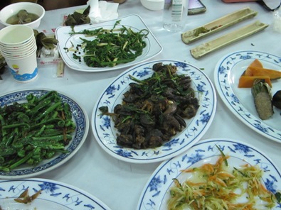 中午是大家期待的風味餐,沒想到竹筒飯居然要用力往地下敲,大大的聲響好像發生什麼衝突,等竹筒裂開時一陣清香的糯米味噴出,真是太棒了啊。桌上的辣椒魚乾,小米香蕉、煮地瓜、馬告珠蔥雞湯、炸溪蝦小魚,每道都是當地的食材,當林克孝老師最喜歡的大蝸牛端上桌時大家都一陣緊張,哇!吃起來很Q很鮮,根本就是放大的炒螺肉嘛!沒想到能在這裡吃到老師最愛的美味!
