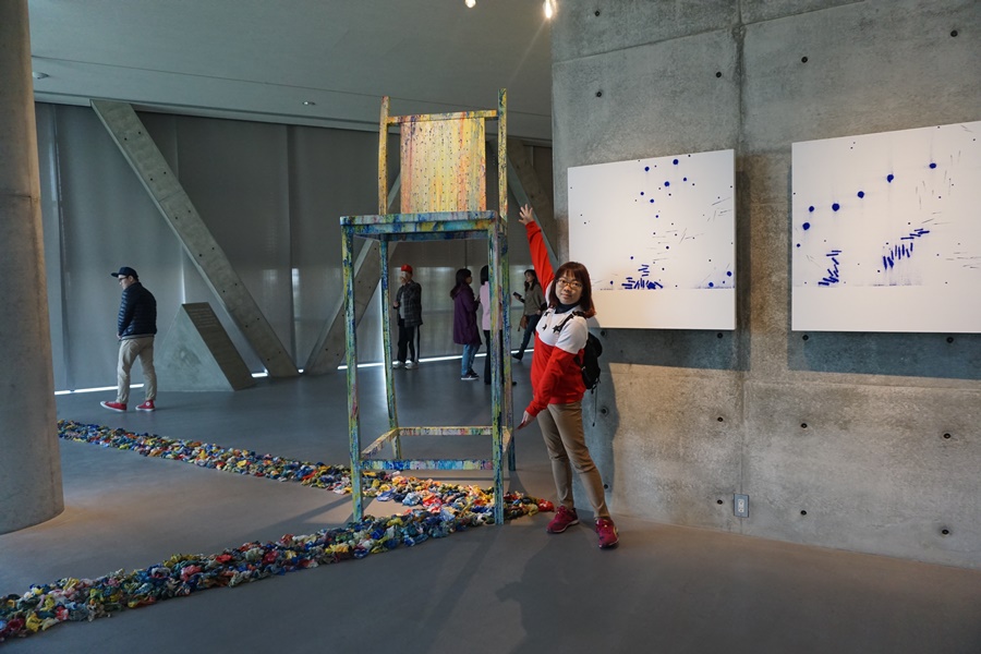 一踏進這棟建物內,第一個反射動作便是關上了聲帶,卻打開了下巴…! 很自然地開啟靜音模式,用眼睛讓自己與建築物對話。這就是它給人們的「存在感」。它靜靜地、沉穩地告訴你:「我在這裡,而你:在我裡面。」我們先聆聽展前說明,進入了三角形格局、充滿木頭香氣的會議廳,另人想到了 「畚箕厝」,但在裡面完全沒有不舒適,講台的背後就是斜面延伸後三角頂端的收尾,這使得觀眾更加的聚焦,真是特別! 李梅齡館長為我們進行參展行前說明,其實她從早上七點多開館就等我們到下午,不得不佩服藝術育成者的修養、耐心及氣質。漫漫等候卻不失對我們灌溉藝術的熱情。精準地介紹現正展出四大藝術家的作品原由、及稍後的參展需要看到的重點。這次的主題「大破大立」是藝術家突破自己的慣性的思維及界限,從日常中去翻轉自認的尋常的作品。放至極大的畫布上揮灑原本的精緻、在巨大裝置藝術上細膩地呈現每一筆色彩。參展者在安藤忠雄的三角形裡感受隨時迎面而來的尖角,隨著腳步移動,指尖忍不住順勢撫摸著清水模,像極了冰山美人光滑柔順的皮膚。一個轉角,樓梯間懸在一至二樓的牆面上的一對桌椅是我最愛的作品。上方灑下三角形的光源是大自然在一日當中不斷變化的天然投射燈。五月天-阿信的作品,一看就是阿信。在升學與歌唱之間的選擇、離開地球表面可以看到的地球、與他最親密樂器、畫筆間的對話,不難理解這就是阿信。「發生VS發聲」:當動物與樂器發聲、當勝利女神與樂器結合,會發生什麼的樣態?透過藝術家的作品讓大眾能夠一目瞭然。