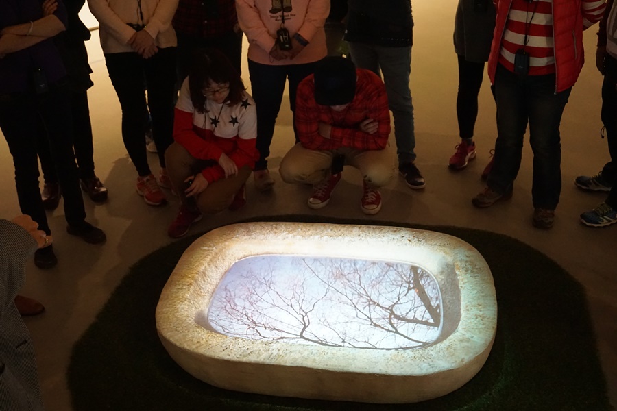 依依不捨結束了安藤忠雄與三角形的對話後,我們又迫不及待地衝往草屯毓繡美術館。迎接我們的庭院一樣是清水模,呼應及延續著本次「雙館齊下」的主題。她是一間私人美術館,而且是不收門票的「稀有生物」,沒有收費還能持續無私的供給民眾藝術知識,真是大心啊!! 毓繡美術館裡的收藏以寫實當代藝術為主軸,敘述著藝術家與身邊人物及物品之間的親密相處。從「人」到「人與物」再到「人與自然共生」為依序,另人印象深刻的實在太多了:人在異鄉的寫實自畫像,比相片還要立體,像是真實的影像呈現在眼前。一顆腐爛柚子樣態的畫作,原來是藝術家從柚子新鮮畫到即將腐敗,紀錄的是當下無形的時間。木刻出來的作品,讓大家在皮件?鐵件?之間傻傻分不清楚!甚至連鏽蝕的大型器具也能用畫作來呈現?木刻出來的堆高機?您能想像嗎??日式木盆中的水草金魚、落在一隅的枯葉、錄像頭射的水影,哪個是真的?哪個是藝術作品?使參展者如夢似幻的從睜眼觀察到讚嘆不可思議!