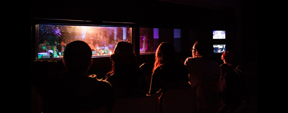 《人類派對》建立在兩個空間,中間用單透鏡隔開,兩邊四個監視器,每次開放20位觀眾進入。第一個空間是「展區」,參觀方式以展品的體驗、互動為主;接下來觀眾進入第二個空間「動物園」,便可以從單透鏡觀看另一批觀眾進入「展區」,此時大家戴上耳機,以聆聽解說、參與團體遊戲的方式,觀看展區中的「人類派對」,而「展區」的觀眾就在不知情的狀況下,變成被觀看的動物。