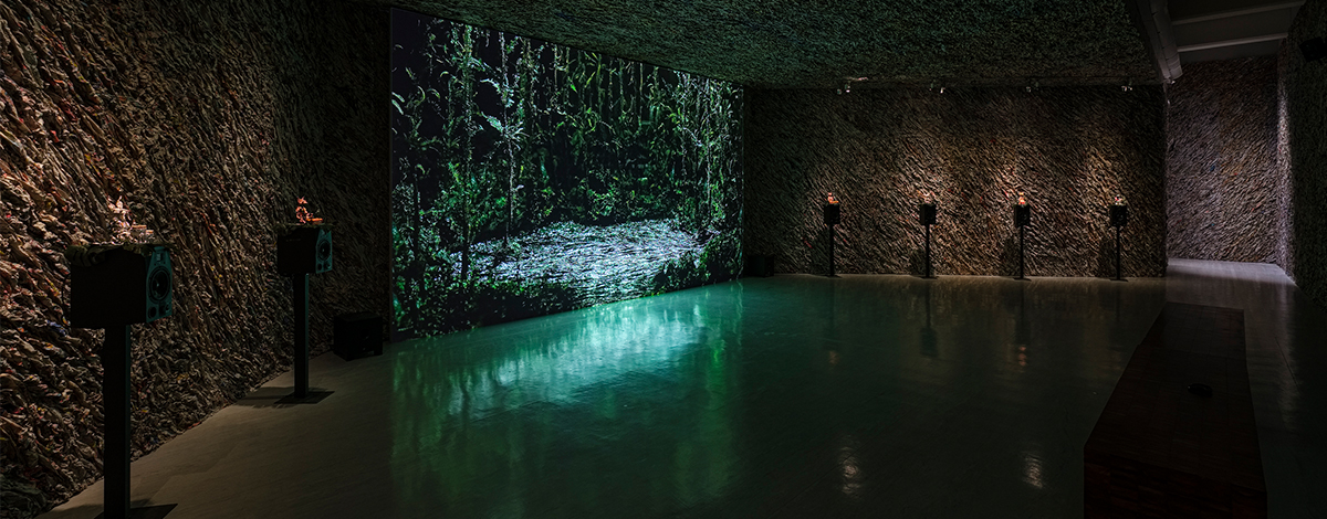 「複眼叢林」內容為張徐展2018年至東南亞駐地研究而開始發展的「動物故事系列」。他近期創作著重探索臺灣文化的在地性如何與國際文化進行對話與連結,藉由創作的再生產,除了發掘文化流動的通則,也整合其中相似又異質的獨特性。本次個展由全世界共有的民間故事著手,將其通則視為敘事容器,帶領觀眾從複眼視角、不同動物形象的流變中,擴張討論文化、身份、世界性與在地性等經驗與探索。